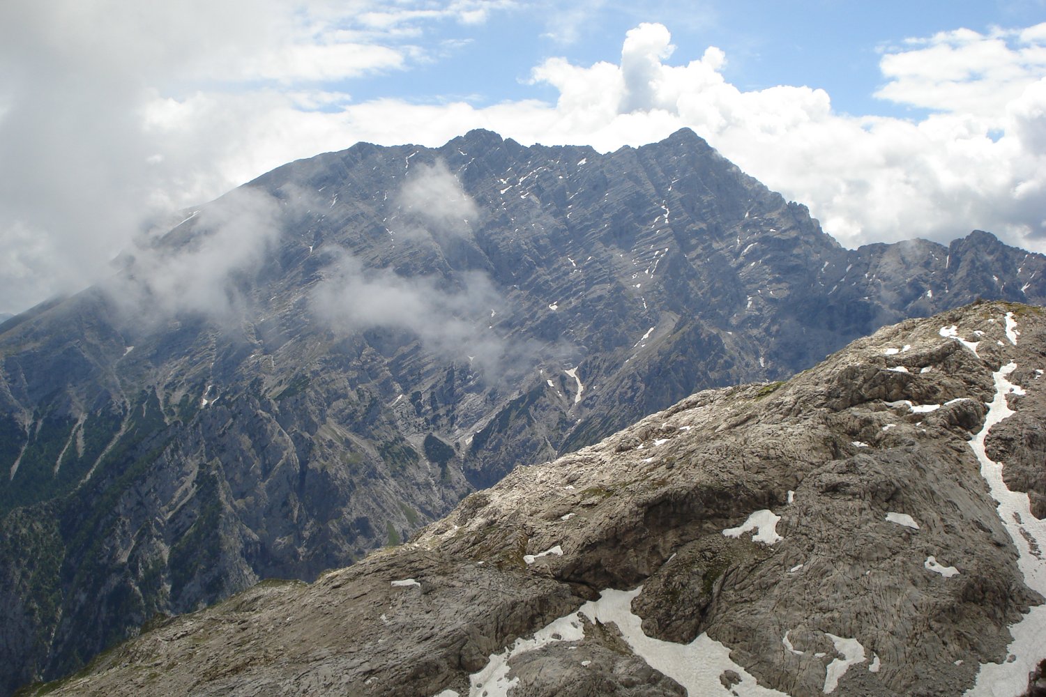 Von der Blaueishütte den Wegweisern Richtung Hochkalter folgen. Auf ca. 1750 m, dort wo sich der Weg zum Hochkalter markant nach Westen (in Richtung der steilen Schotterriese) wendet, linkshaltend in Richtung Blaueis weiter. Auf dem ausgeprägten Steig bis zum Fuß der Schärtenspitze-Westflanke (nicht zum Blaueis hinauf!). Beginn des z. T. gesicherten Gipfelsteiges bei kurzer Leiter.