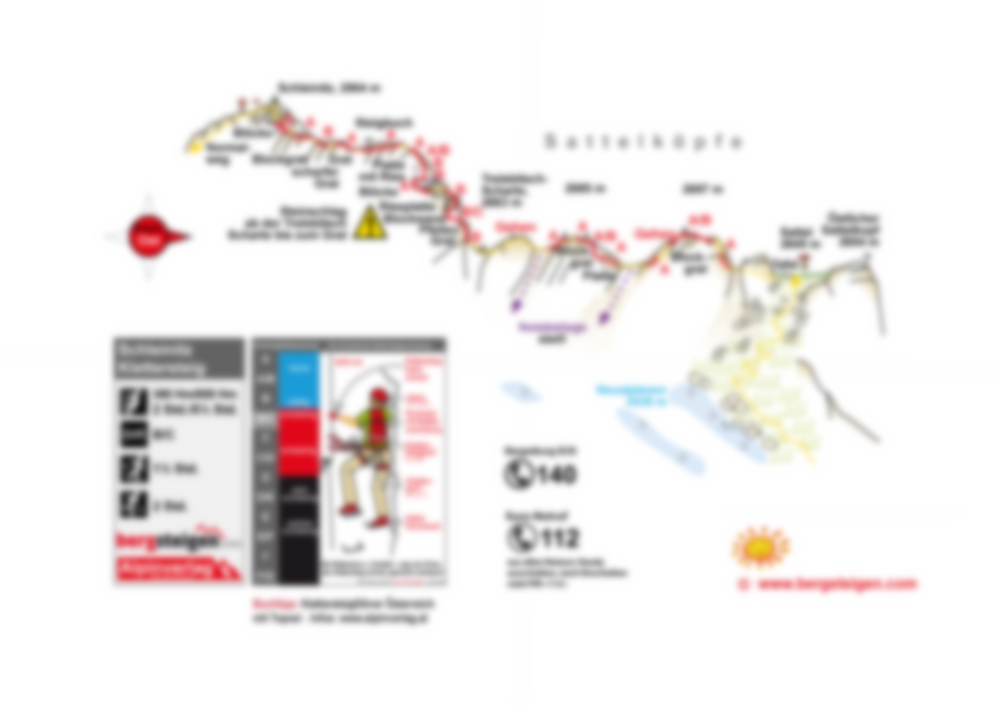 Siehe Topo-Skizze. Die Schwierigkeiten liegen im letzten Drittel, dort sind steile Passagen (bis B) zu bewältigen. Auch der scharfe Grat am Ende der Tour hat eine kurze B-Stelle.