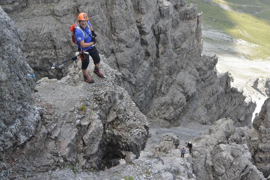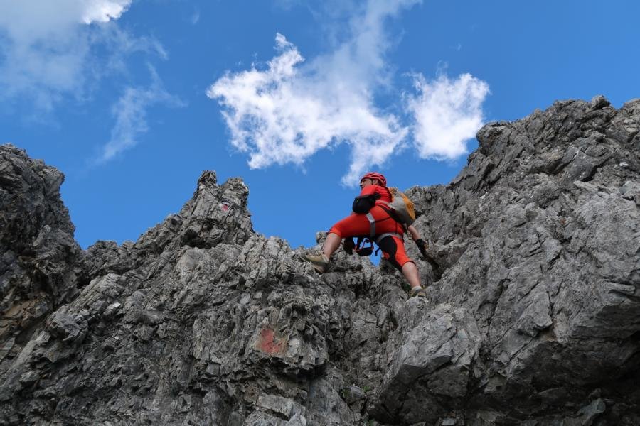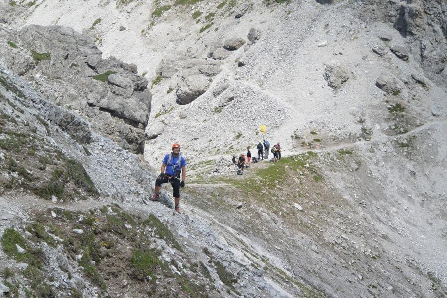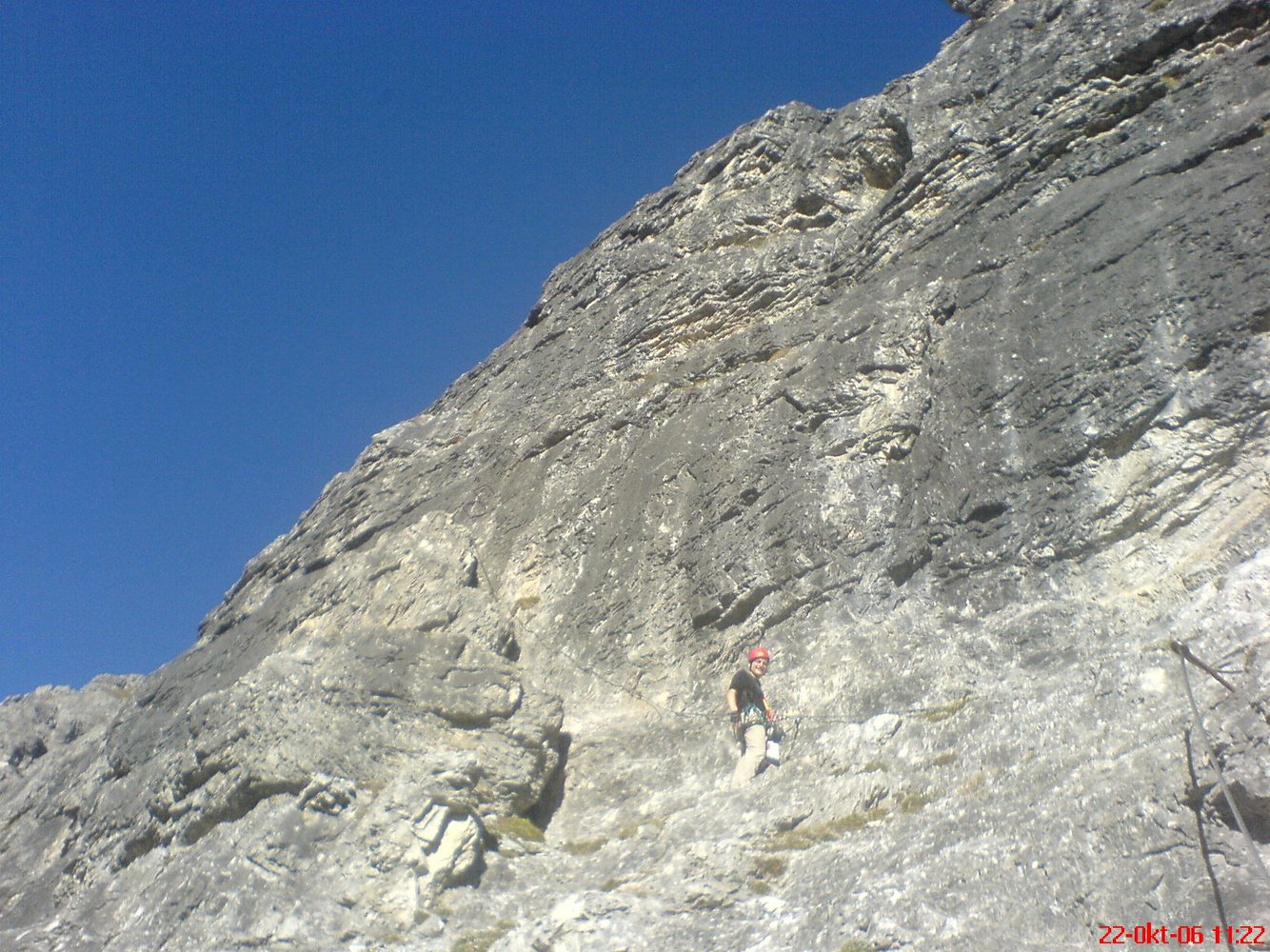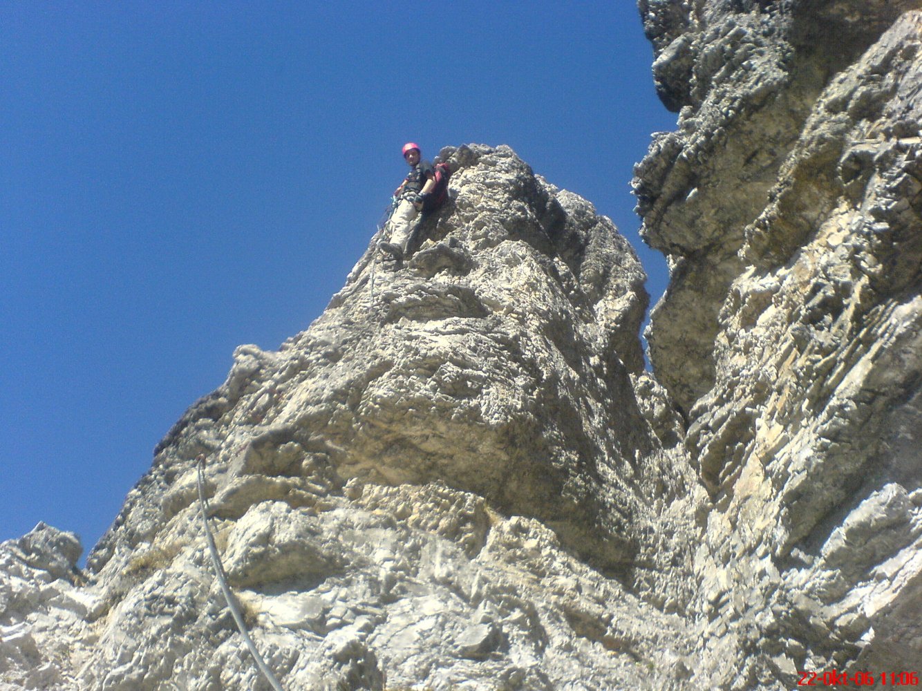 Vom Gipfel der Markierung über den Nordgrat folgen, dieser ist in der Steilstufe kompl. versichert und nicht zu unterschätzen (Klettersteigausrüstung und Helm am Gipfel gleich anlassen).
