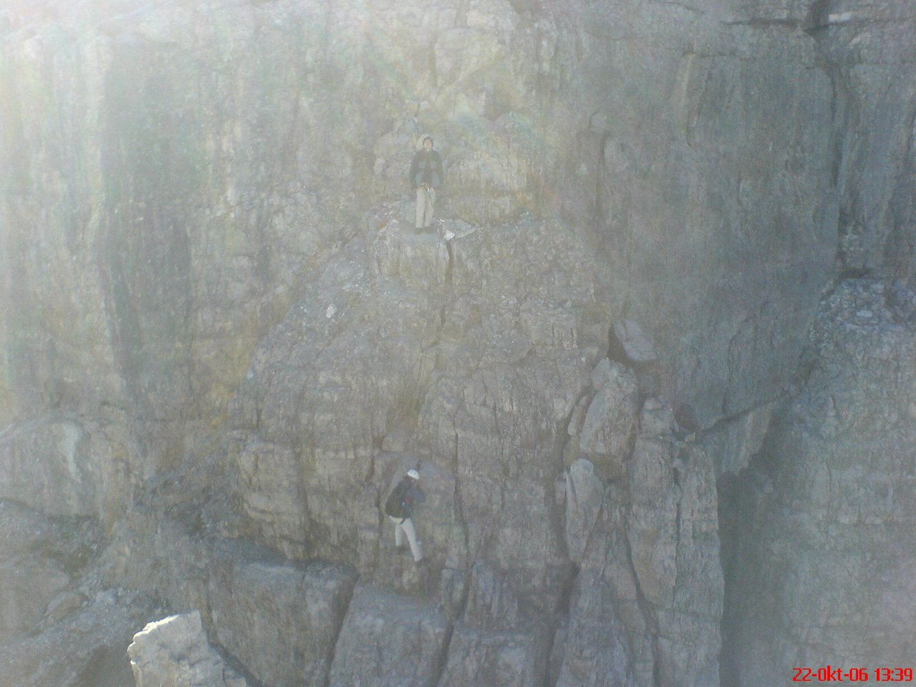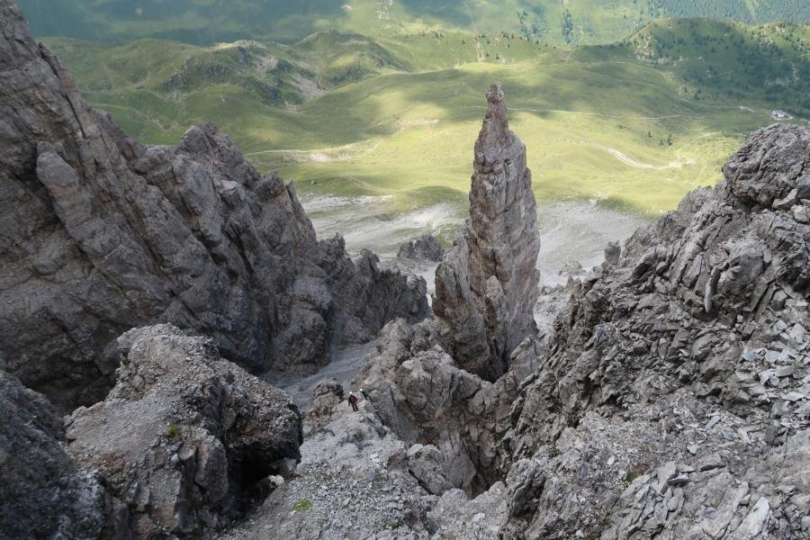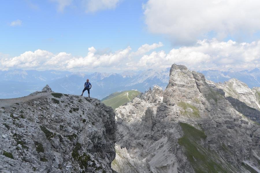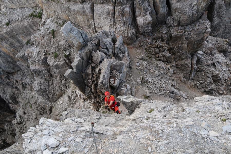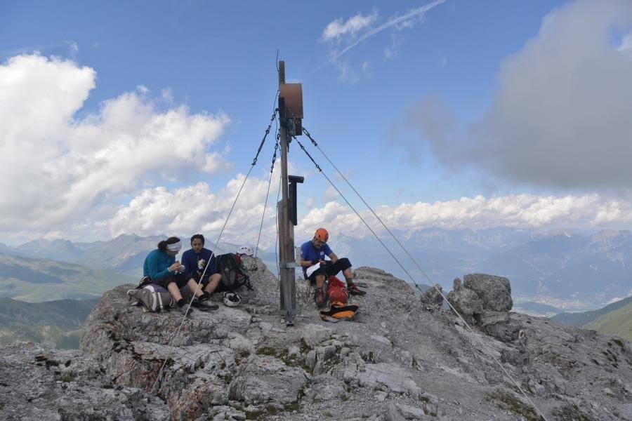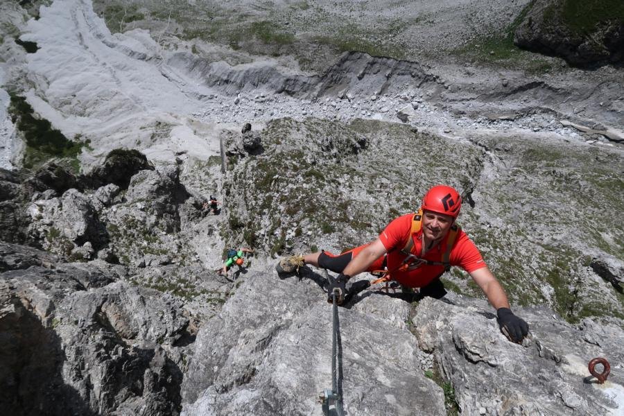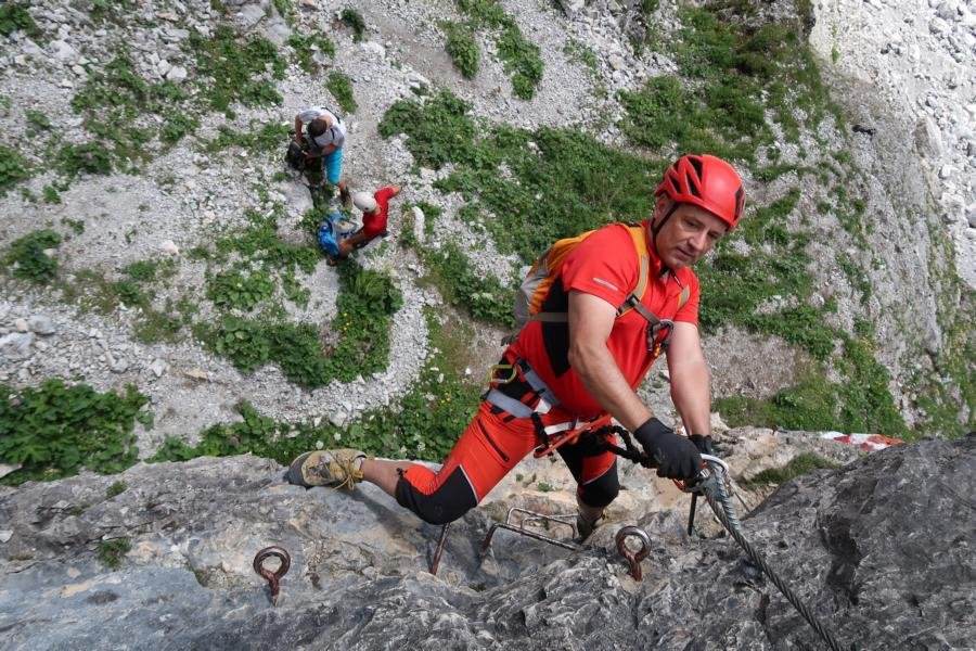 Vom Gipfel der Markierung über den Nordgrat folgen, dieser ist in der Steilstufe kompl. versichert und nicht zu unterschätzen (Klettersteigausrüstung und Helm am Gipfel gleich anlassen).