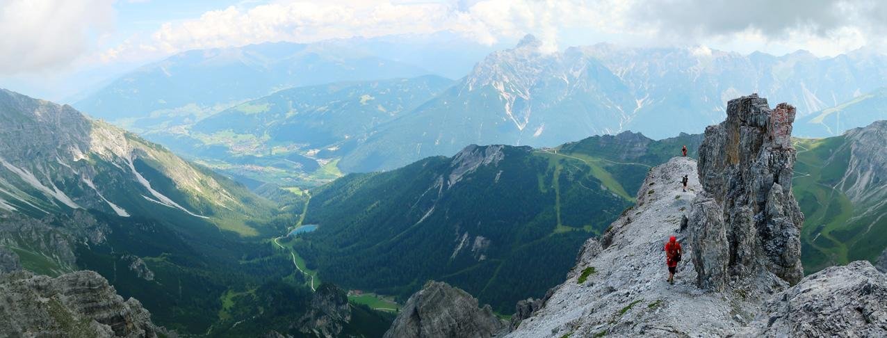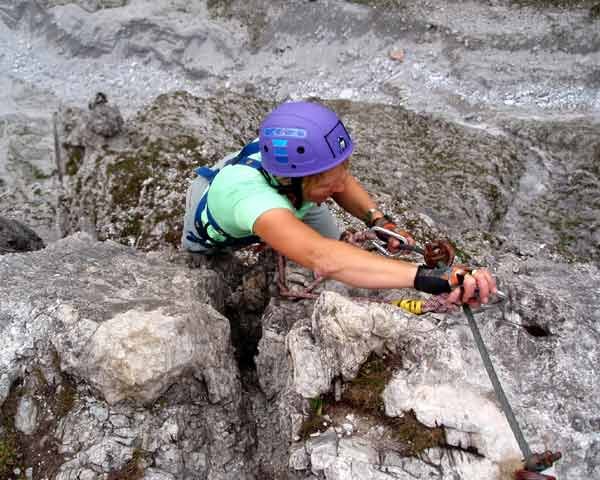 Kompl. Klettersteigausrüstung, Helm und unbedingt Sicherungsseil für schwächere Geher und Kinder. Klettersteighandschuhe sind von Vorteil!
