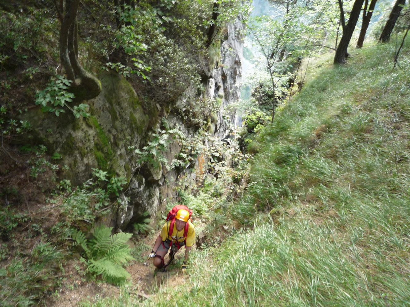 Vom Ende der Versicherungen des Schmugglerweges durch eine steile Erdrinne und ein Waldstück zu einer Farnwiese aufsteigen. Die Farnwiese queren und entlang der Steigspuren zu einem markanten Block absteigen. Das Bachbett queren und weiter den Steigspuren zu einem Baum mit orangefarbenem Pfeil folgen. Nicht zu weit rechts halten und nicht an den gelb markierten Bäumen orientieren! Eher links halten und den orangefarbenen Markierungen zu einer Abkletterstelle (A/B) folgen. Darunter befindet sich die erste Abseilstelle. 35 m abseilen und auf Steigspuren in ein Bachbett mit fast weißem Gestein („Weißer Bach“) absteigen. Das Bachbett queren und über eine Abkletterstelle (A/B) zur zweiten Abseilstelle. 50 m in eine enge Schlucht abseilen, dann den Steinmännern folgen und steil zur Hauptstraße absteigen. Auf der Straße rechts zurück zum Ausgangspunkt. Pass nicht vergessen!
