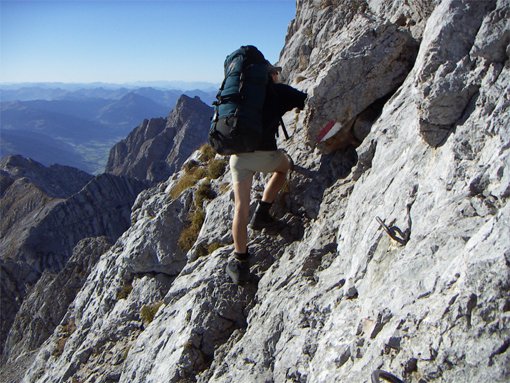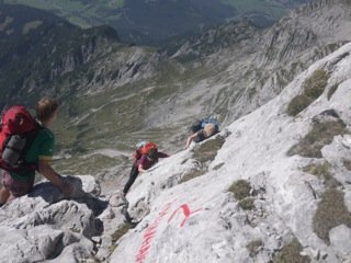 Achtung: Dieser Anstieg ist ein Mix aus schwerem, alpinen Wanderweg (markiert) und kurzen Kletterpassagen. Reine Klettersteiggeher, die es gewohnt sind dem dicken Stahlseil zu folgen, sind an der Schönfeldspitze vermutlich fehl am Platz. Auch der reine Wanderer, der keine Erfahrung im leichten Schrofengelände hat, sollte diese Tour meiden.