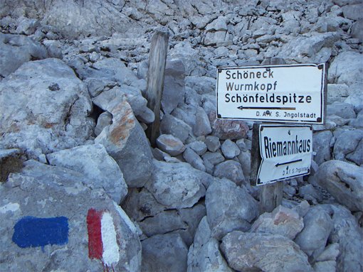 Vom Parkplatz Sandten auf dem markierten Weg zum Riemannhaus. Vom Riemannhaus (2177 m) auf dem markierten Weg – vorbei am Wurmkopf – zum Beginn des Steiges.