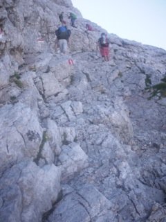 Zu Beginn leichte Kletterei 1/1+ durch die Schrofenflanke (tlw. auch Eisenstifte; A/B), hinauf zu einem Band auf dem man südseitig zur Ostflanke quert. Eine kurze luftige Plattenpassage (B/C) ist mit Klammern zum Festhalten. Nach dieser erreicht man in wenigen Minuten im Schrofengelände den Gipfel.