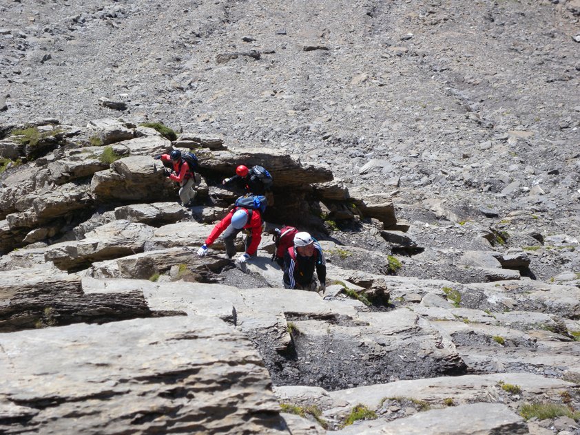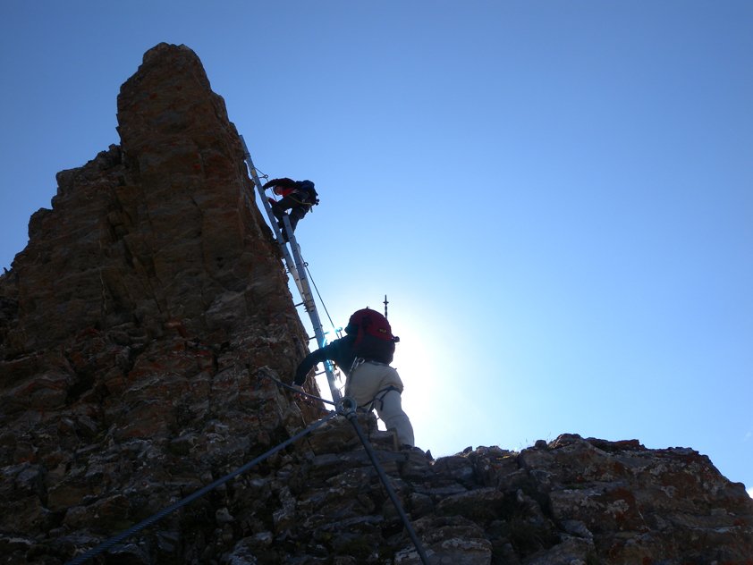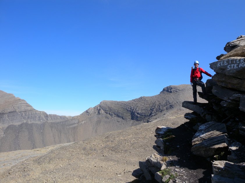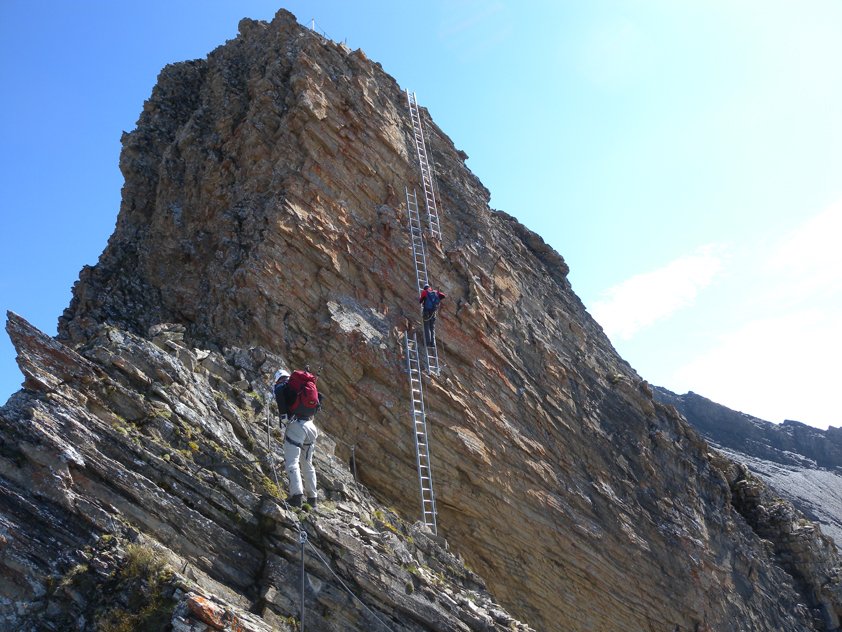 Von der Einstiegstafel zuerst neben der Felswand, dann rechts über Platten (A) hinauf zum Großen Chrinne (Übergang). Dort rechts zum Beginn des eigentlichen Klettersteiges. Nach einer kurzen Gratpassage folgt gleich die Schlüsselstelle (B/C), eine Steilstufe unterhalb der ersten Leiternreihe. Die Leitern sind luftig aber nicht schwer (B), vor allem die Drei-Leitern-Reihe (B) ist fantastisch zu klettern. Danach folgt man dem Grat (A), kurze steile Passagen (B) lockern den Weg zum Gipfel auf. Der Hauptgipfel liegt etwas hinten und ist von unten nicht genau zu sehen.