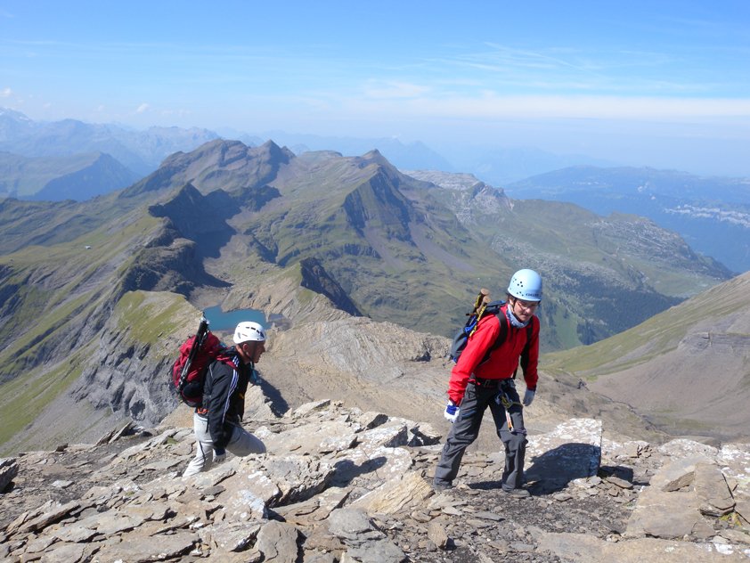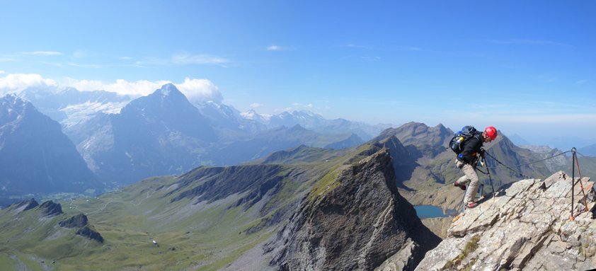Teilweise sehr luftig geht es auf dem Schwarzhorn-Klettersteig Richtung Gipfel, immer mit einem herrlichen Bergpanorama vor Augen - Eiger und Schreckhorn sind nicht die einzigen Berge die uns aus der Ferne grüßen. Besonders lohnend ist der etwas längere Abstieg über die Große Scheidegg, eine weniger bekannte Ecke von Grindelwald. Dank der Bergbahn kann diese schöne alpine Unternehmung als gemütliche Tagestour gemacht werden.