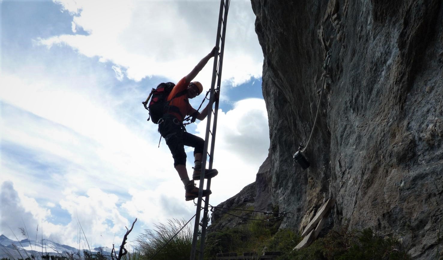In Zermatt, dem Dorf am Fuße des Matterhorns (meistfotografierter Berg der Welt) gibt es auch einen Klettersteig. Die unscheinbare, grasdurchsetzte Wand über der Bergsteigermetropole bietet drei interessante Klettersteigrunden in fast allen Schwierigkeiten. Route A ist absolut anfängertauglich, Route B hat eine schwierige Leiter als Einstieg und in Route C geht es so richtig hoch hinaus. Als Belohnung gibt es am Ende der Quälerei auf der Schweifi nen noch einen Ausblick auf Matterhorn und Monte Rosa, bei dem man so richtig wahrnimmt, dass man in der Walliser-4000er-Region ist.