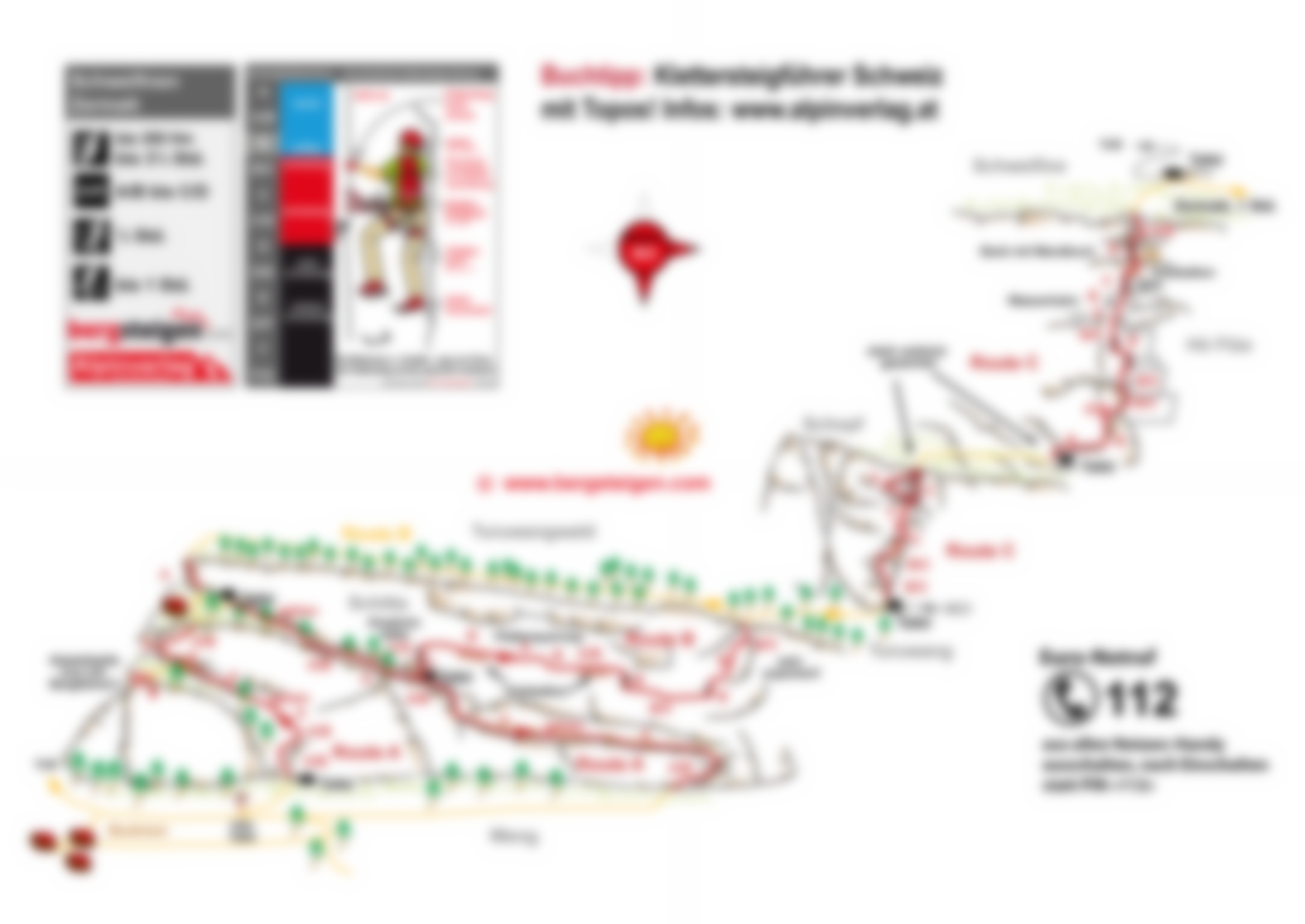 Route A: Gestuft im Zickzack (A/B) hinauf auf ein schräges Band unter der Felswand. Nach links, bis man die Abzweigung zur Abseilplattform (nur mit Bergführer) erreicht (alles max. A). Es folgt eine kurze Wandstufe (B) zu einer Almhütte. Dann zur nächsten Wand aufsteigen und rechts über ein Band absteigen (A/B). Nach der Abzweigung der Route B (Tafel) steigt man auf ein weiteres Band ab (A/B) und zum Ausstieg (1 Std.). Route B: Von der Abzweigung über eine extrem steile Leiter (bis C/D) zu einer langen Plattenquerung (bis B/C), die zu einem exponierten Ausstieg (B/C) in der nächsten Waldzone führt. Dort nach links aufsteigen, am Ende des Waldbandes zur Almhütte (siehe Route A) absteigen und über Route A zurück (2 Std.). Route C: Am Ende der Route B auf einem Weg nach rechts gehen, bis man die nächsten Felsen erreicht (Tafel). Man klettert konstant mäßig schwer (B/C) über einen gestuften Pfeiler hinauf. Am Ende erhöhen sich die Schwierigkeiten etwas (C). Die letzte Leiter kann über eine Linksschleife umgangen werden. Gehend erreicht man die nächste Plattenwand. Ein kleiner Pfeiler (B) leitet zu einer Plattenfl ucht, die mittels Klammern und Leitern (bis B/C) überwunden wird. Es folgt ein kurzes, senkrechtes Netz (C) und direkt vor dem Ausstieg gibt es auch noch einen Rastplatz.
