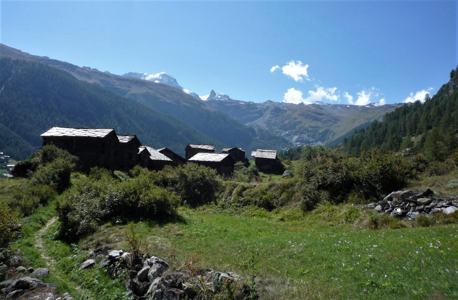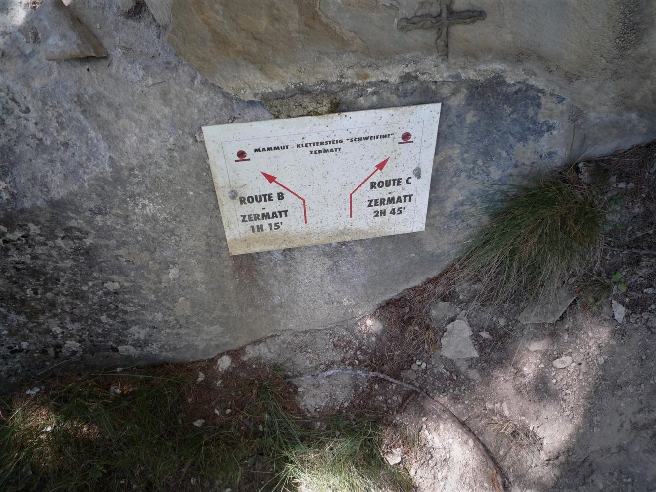 Route A: Am Wandfuß auf einem Weg zurück zum Einstieg queren. Route B: Über Route A. Route C: Vom Ausstieg noch ein kurzes Stück über Matten (Wiesen) bergauf, bis man bei einem Felsblock den Wanderweg Zermatt-Trift erreicht, über den man nach rechts zum Bahnhof Zermatt absteigt.