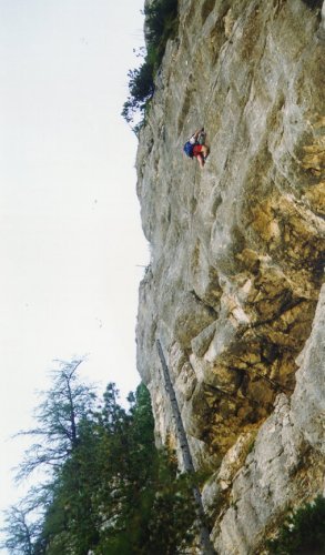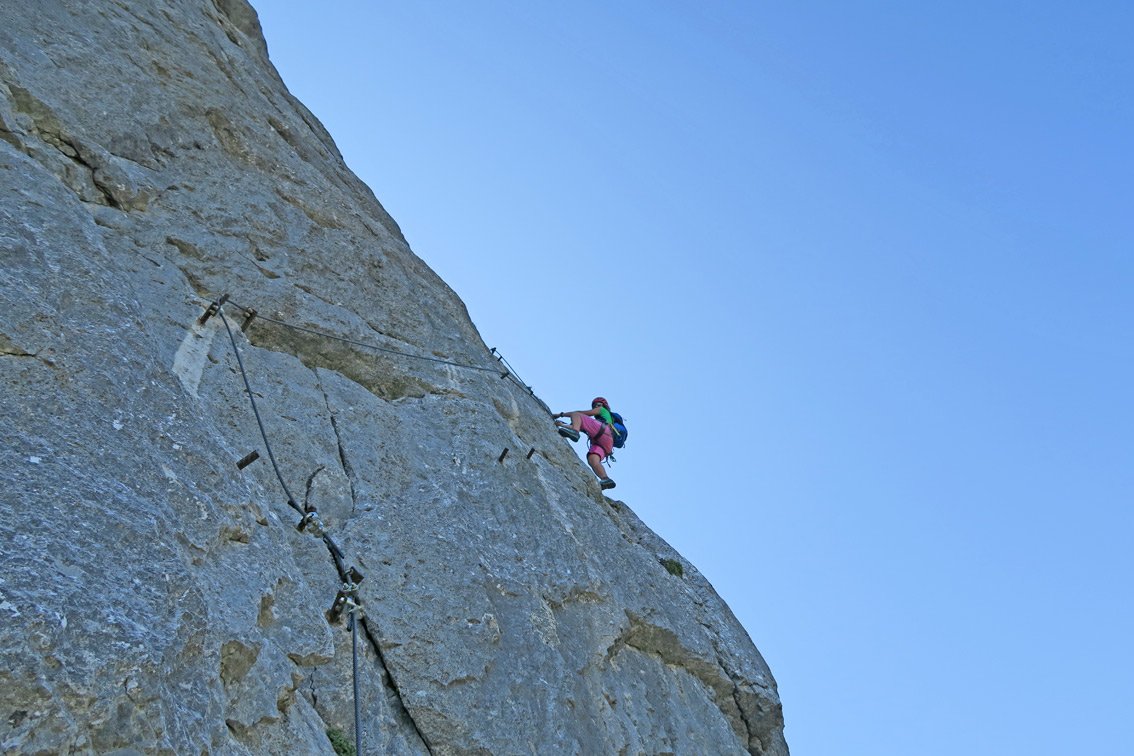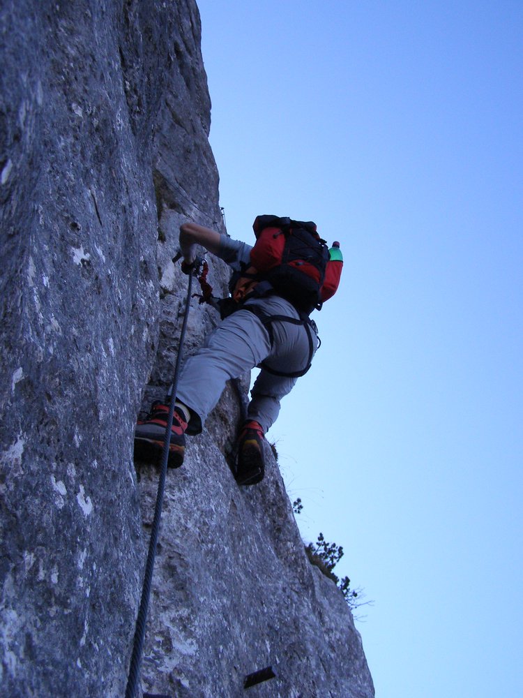 Wer Reibungskletterschuhe mit hat, sollte diese jetzt anziehen. Nun über das sehr ausgesetzte Putz-Band zum Steigbuch am Beginn des 100-Meter-Pfeilers vorstoßen. Hier sollte nochmals gerastet werden, um vor allem den Armen etwas Ruhe zu gönnen. Der erste Aufschwung (E) stellt die Schlüsselstelle des Steigs dar. Den restlichen, zwar etwas leichteren, aber immer noch rassigen Teil des Pfeilers (D-E) mit seinen tückischen Aufschwüngen empor. Zum Schluss nochmals durch erdiges Gelände und man hat es geschafft.