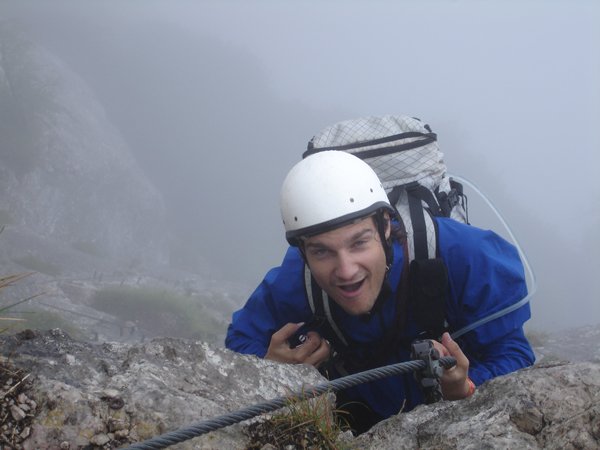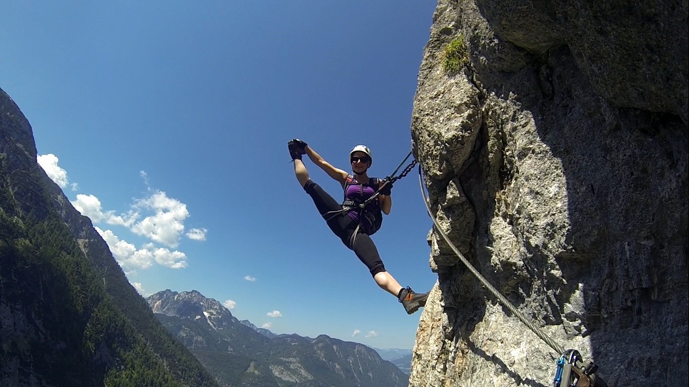 Komplette Klettersteigausrüstung, Helm, Klettersteighandschuhe, Kletterschuhe, Sicherungsseil und Geld für die Talfahrt.