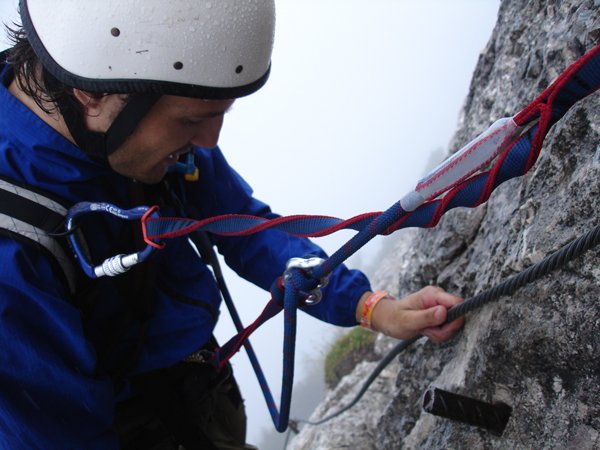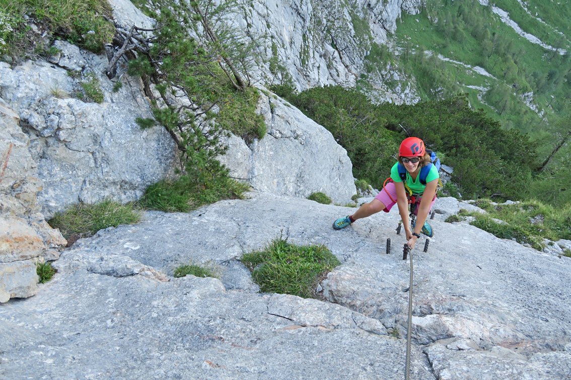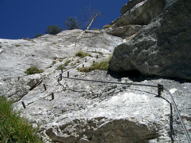 Stahlseil, Trittstifte, Bügel. Auch leichte Passagen sind großteils mit Seil versichert. Am 100-Meter-Pfeiler sind die Abstände zwischen den Verankerungen unangenehm groß.