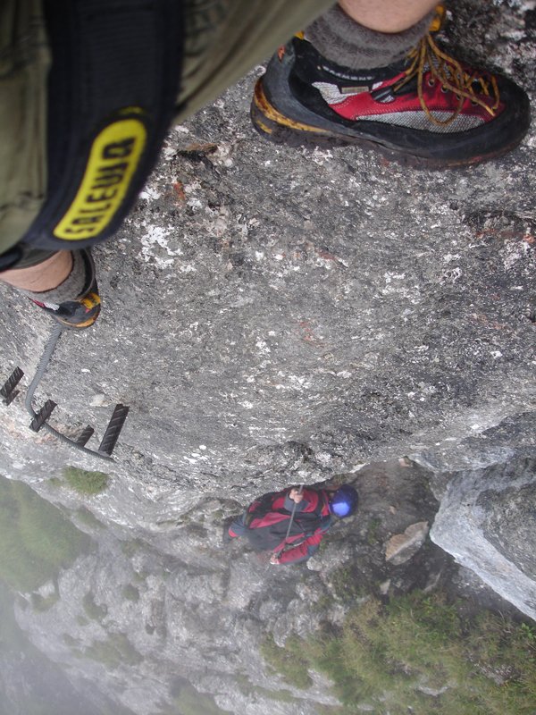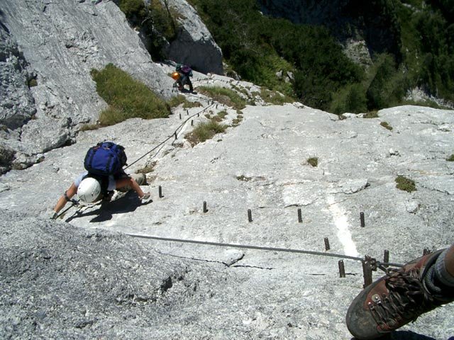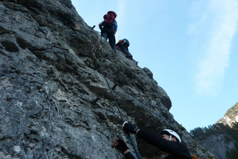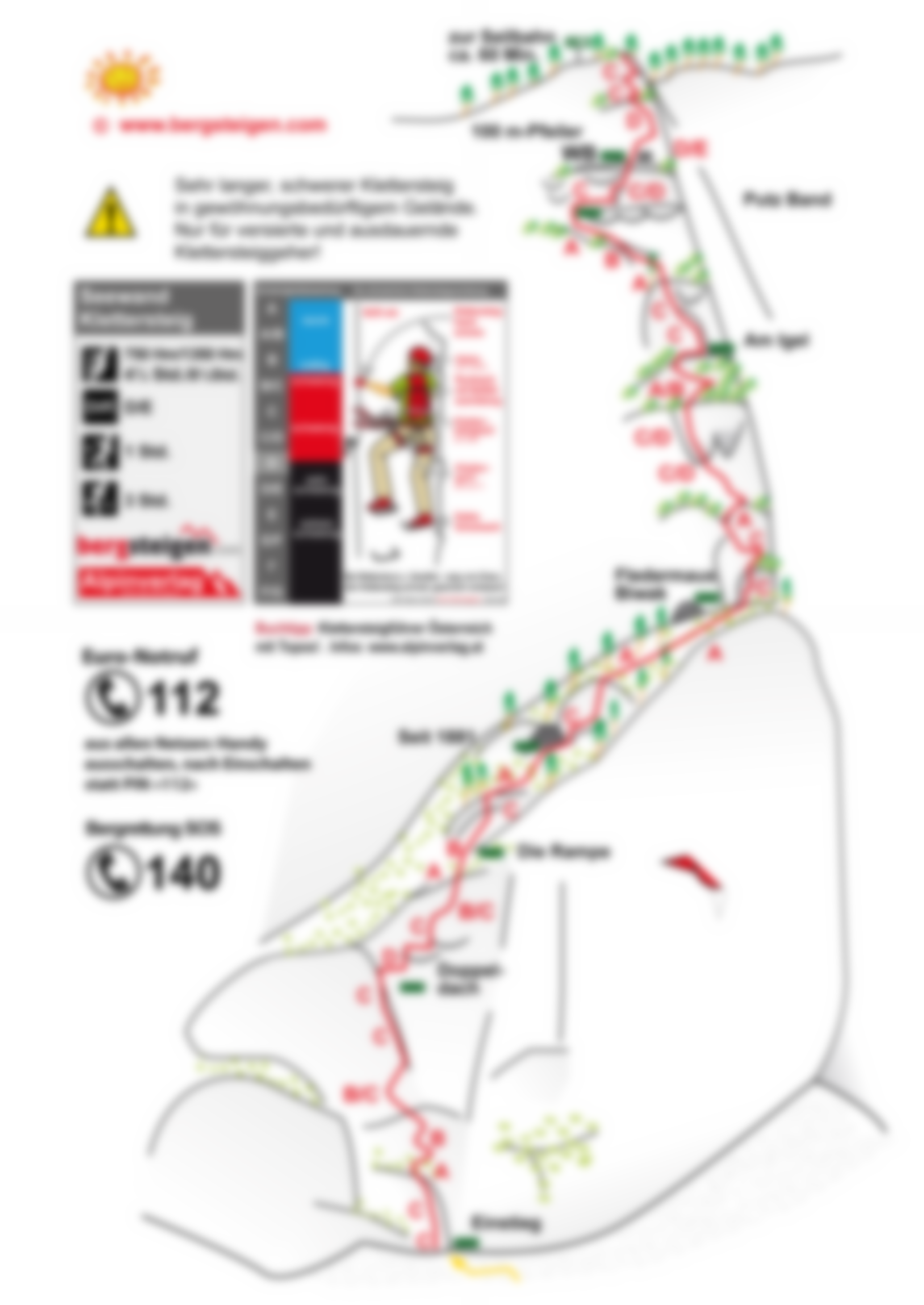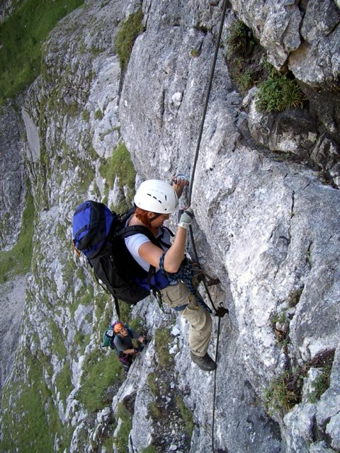 Sehr langer, extrem schwerer Klettersteig in gewöhnungsbedürftigem Gelände. Mit E bewertet. Für Anfänger und Kinder überhaupt nicht geeignet. Seilschaftsverband ist anzuraten. Die gesamte konditionelle und psychische Anforderung ist sehr hoch, weiters ist auch das Wetter zu berücksichtigen. Nach und bei Regen ist der Steig gefährlich, bei Schnee natürlich auch! Der Fels ist nicht immer zuverlässig fest.