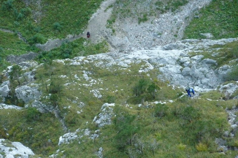 Siehe Topo. Die steile Einstiegsfelswand (C-D) führt in flacheres, aber oft feuchtes und dann unangenehm rutschiges Gelände. Im Zick-Zack-Kurs zu einem mit Trittstiften entschärften Wandl hoch. Danach folgt das Doppeldach (D/E), zwei kleine, unmittelbar aufeinander folgende, anstrengende Überhänge. Über die Rampe zu einem anspruchsvollen Steilaufschwung (C-D). Danach über leichtes, steiles Gehgelände zum Punkt "Seit 1881". Dort befindet sich eine kleine Grotte (Notunterstand), zu der man bereits zu dieser Zeit aufgestiegen ist. In den Fels gemeißelte Namen von Treibern, die für die kaiserliche Jagd das Wild in die Wand trieben, sind hier verewigt. Der Platz sollte für eine Rast genutzt werden, um Kraft für den anspruchsvolleren zweiten Teil zu tanken.