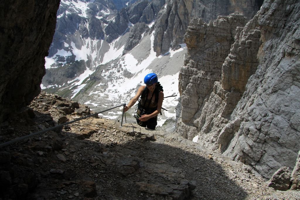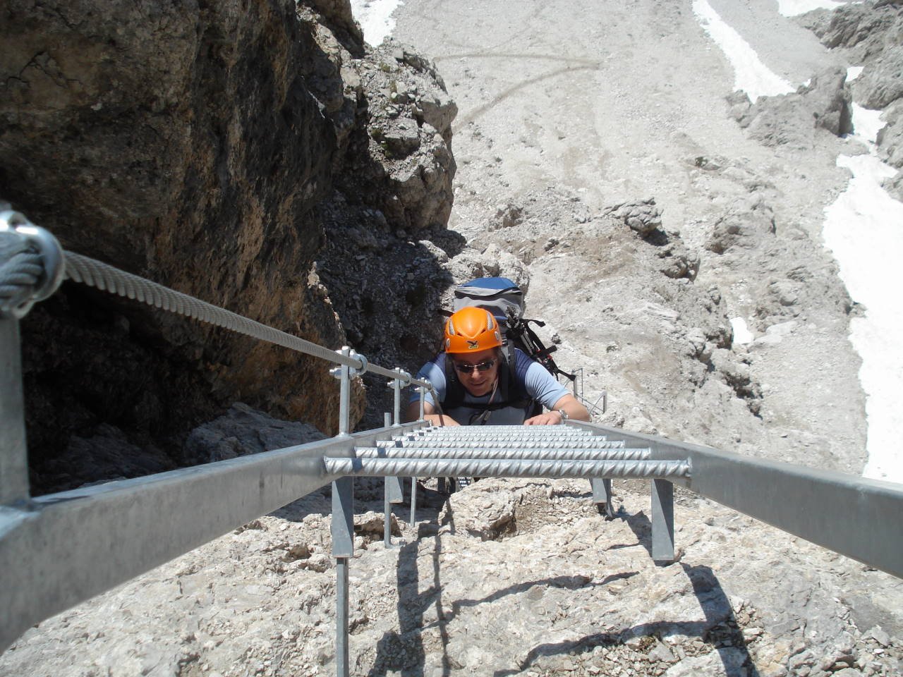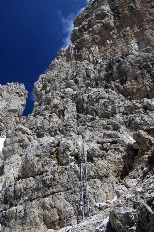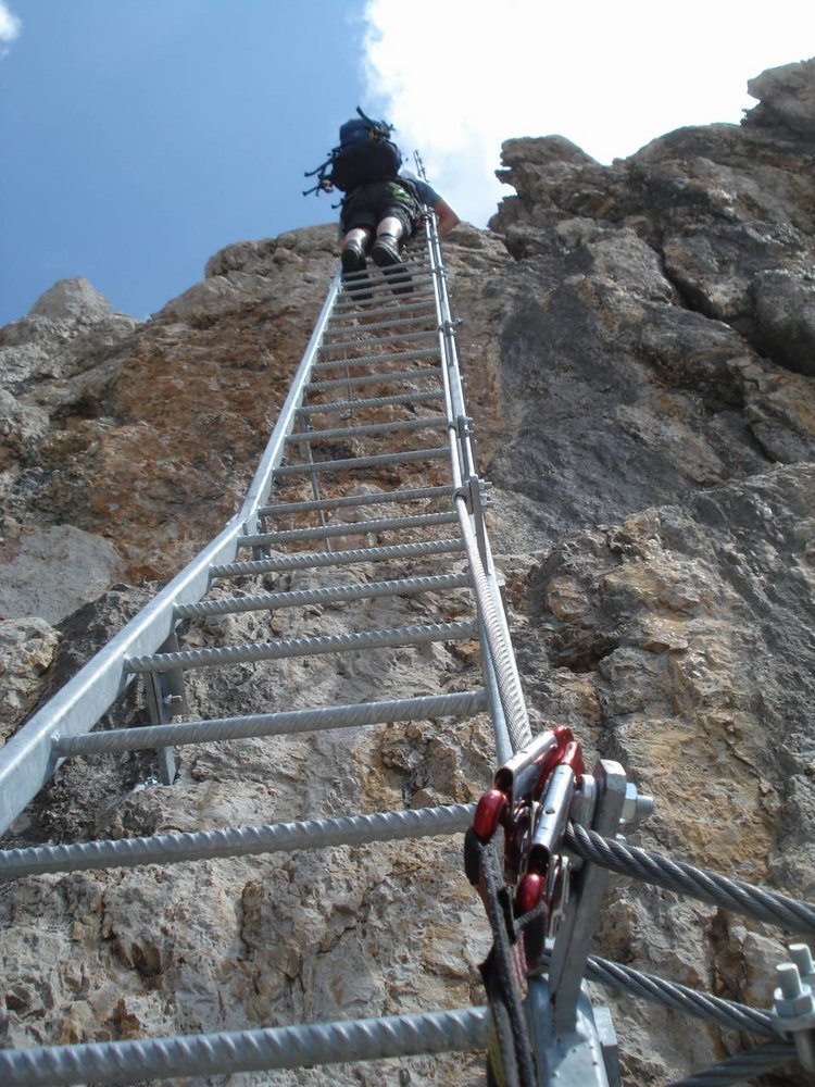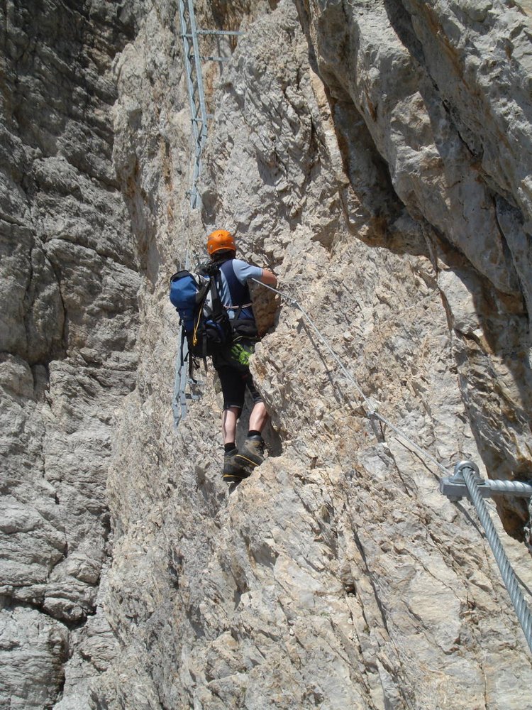 Siehe auch Topo. Vom Einstieg auf einer Rampe (B) links aufwärts und über gestuftes Gelände auf ein Schuttband (A). Weiter zur ersten Leiter (B), an deren Ende schließt gleich die zweite, kürzere Leiter (B) an. Entlang der Seilsicherungen aufwärts zur dritten Leiter (B), danach im Zickzack auf gestuftem Gelände hoch, bis man sehr ausgesetzt (C) zur leicht überhängenden Leiter (B/C) quert. Dann auf einem Band (A/B) nach links in die Scharte.