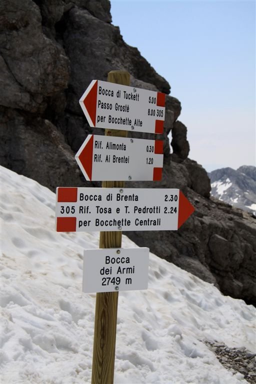 Von der Scharte Bocca d‘Armi hat man mehrere Möglichkeiten: 1.) Man folgt links dem Sentiero Bocchette Centrale und gelangt so wieder zurück zur Pedrotti-Tosa Hütte. 2.) Man steigt über den meist problemlos zu begehenden Sfulmini Gletscher zum Rif. Alimonta und weiter zum Rif. Brentei ab. Vom Rif. Brentei auf dem Sentiero dei Brentei (Weg Nr. 318) zur Bocca di Brenta aufsteigen und von der Scharte hinunter zur Pedrotti-Tosa Hütte.