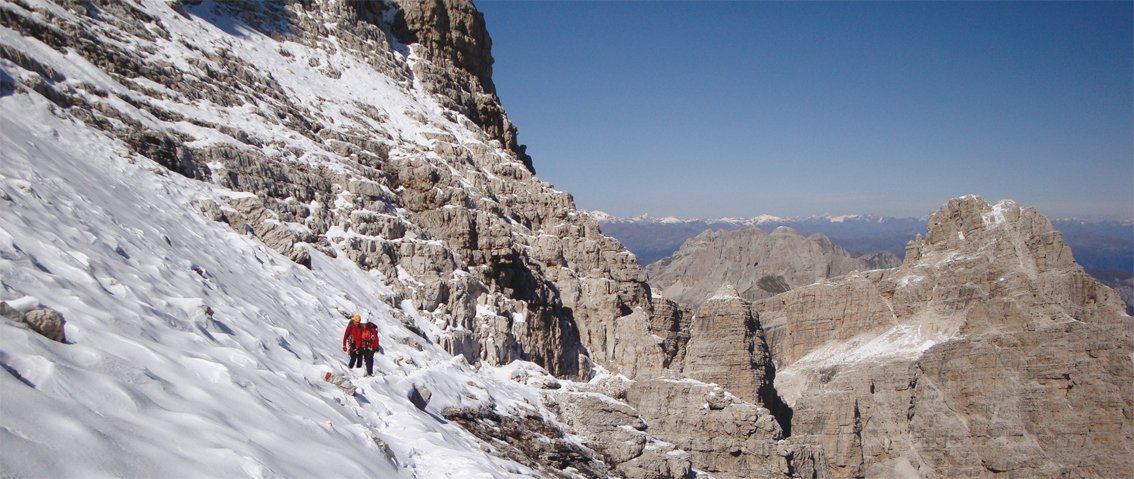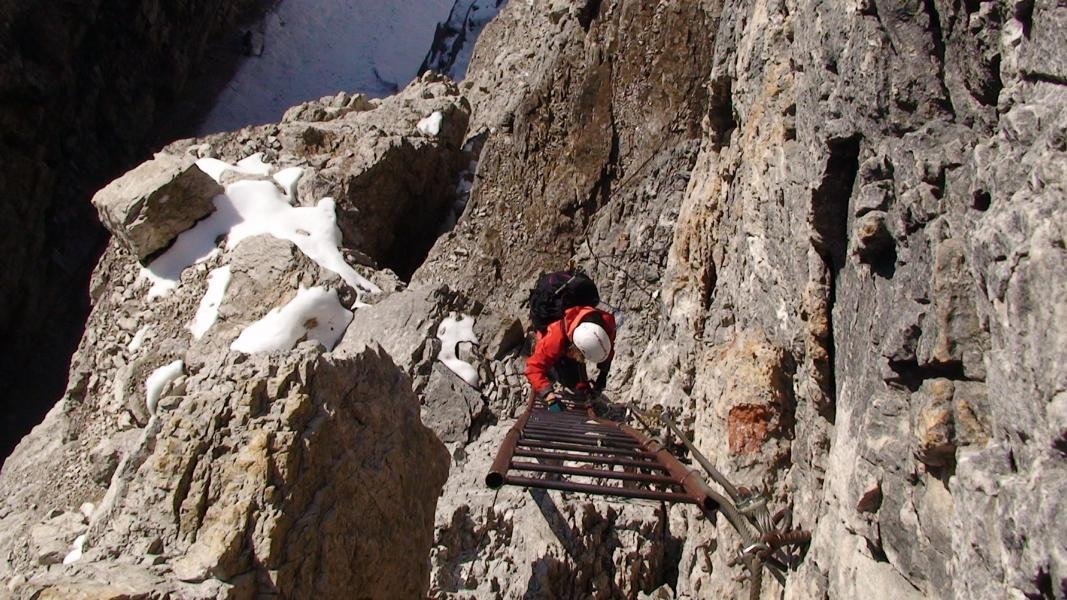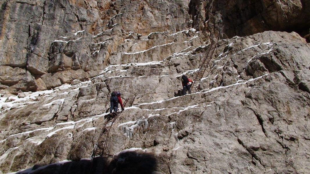 Die wohl kühnsten Klettersteigmeter des Bocchetteweges und somit das vertikale Highlight der Brentadurchquerung. Fantastisches Auf und Ab über ausgesetzte Leitern und schöne Querpassagen auf den „Brentabändern“ - Dolomitenfeeling der Extraklasse! Am Ende des langen Steiges kann man über eine sehr steile, aber gut mit Leitern gesicherte Abstiegsvariante zum Rif. Alimonta absteigen. Dieser Abschnitt ist von vielen Leitern geprägt, Scala degli Amici bzw. Scala degli Dei sind die mit vielen Sprossen ausgestatteten Höhepunkte.