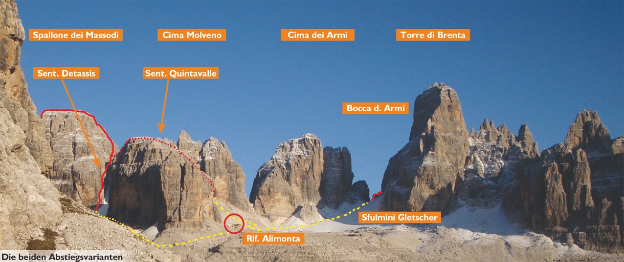 Vom Einstieg steigt man zuerst gestuft (A/B) über Absätze bis zu einer langen Leiter (A/B). Danach wechseln kurze, tlw. recht steile Stufen (bis B/C) mit Leitern, die zum sog. Garbari-Band führen, knapp unter der 3000er Marke. Über Bandsysteme (A) und Schrofen (1-, bei Schnee heikel!) erreicht man das Ende des Bandes und steigt über eine Leiternrinne (B) in eine Schlucht (Eisrinne, siehe Topo) ab. Danach über Bänder (A) bis zum höchsten Punkt (3020 m), dort über Leitern (B) bis zu einem Spreizschritt (A/B). Danach steigt man über die lange Leiter „Scala degli Amici“ (Leiter der Freundschaft) auf und vom Plateau auf 3004 m gestuft, aber nicht allzu schwierig (bis B) zu einem Band ab. Eine Querung und Leitern (bis B) leiten den Abstieg ein. Eine Leiter nach der anderen (B) wird bis zur Abzweigung in die Bocca dei Massodi (Tafel) abgestiegen. Dort zwei Möglichkeiten: 1) Sent. Umberto Quintavalle: Ausgesetzt (C) in die enge Scharte und auf der anderen Seite über eine Leiter (B) auf ein Schuttplateau, von diesem zum Rand des Sfulmini Gletschers absteigen (Stellen B, viel gehen). 2) Sentiero Oliva Detassis: Von der Tafel sehr steil über eine fast 100 Hm lange Leiternreihe abwärts. Die steilste Leiter ist die Scala degli Dei (C) „Götterleiter“, viele Leitern B, dazwischen gibt es auch die eine oder andere Rastposition. Der kühne Abstieg endet bei einem Spalt.