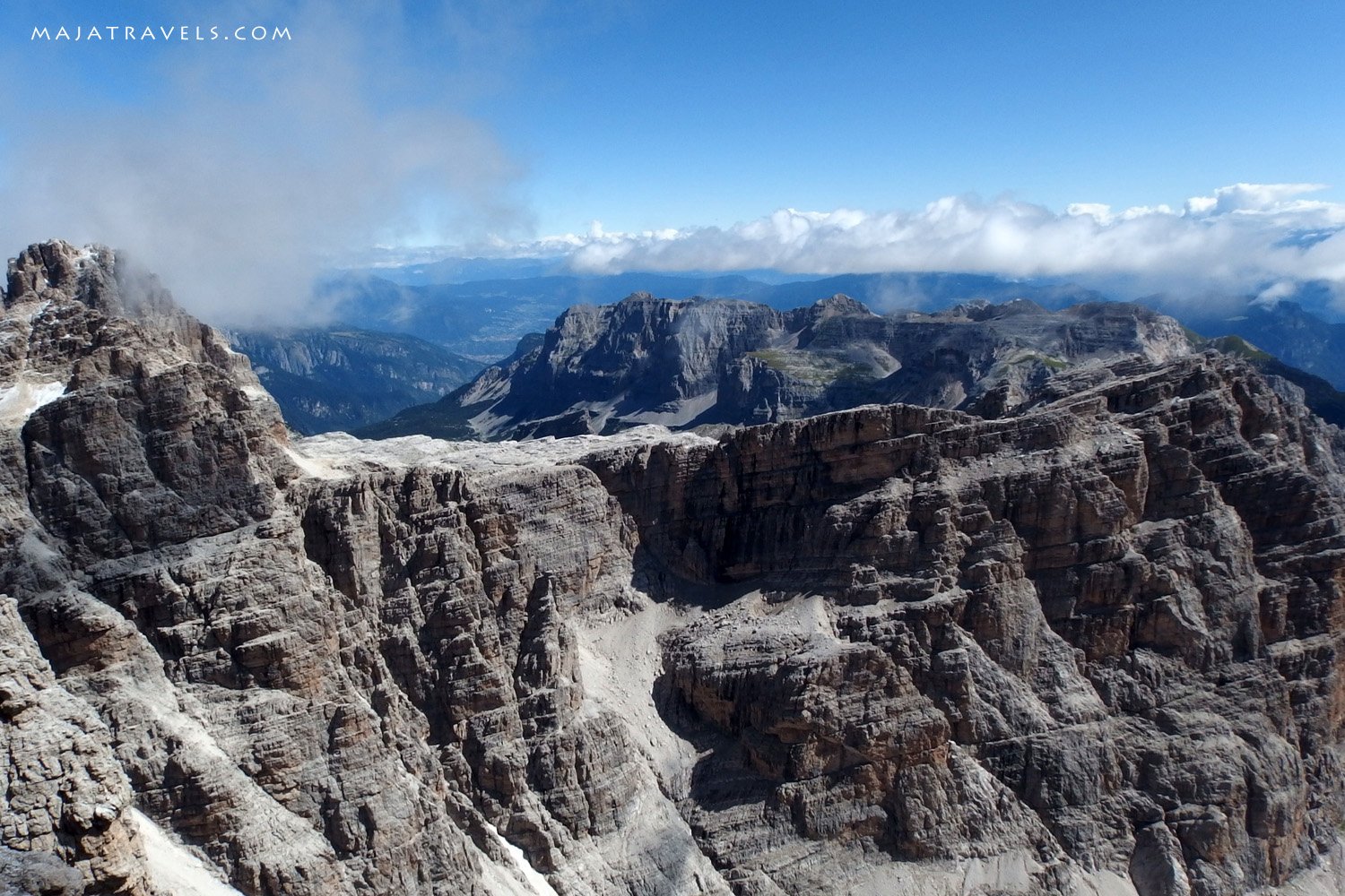 Ernste Klettersteigunternehmung - am Ende wählt man je nach Kraftreserven entweder den direkten Detassis Abstieg oder die etwas längere, aber nicht ganz so anstrengende Variante zum Sfulmini Gletscher. Vor allem bei diesem Teil spielt das Wetter eine entscheidende Rolle: Bei Nässe oder Schnee tlw. heikle Passagen, auch die Leitern sind naturgemäß rutschiger. Der Aufstieg zur Cima Brenta sollte nur von guten Alpinkletterern gewagt werden (bis 2-, evtl. Firnfelder, Abzweigung beim Garbari-Band).