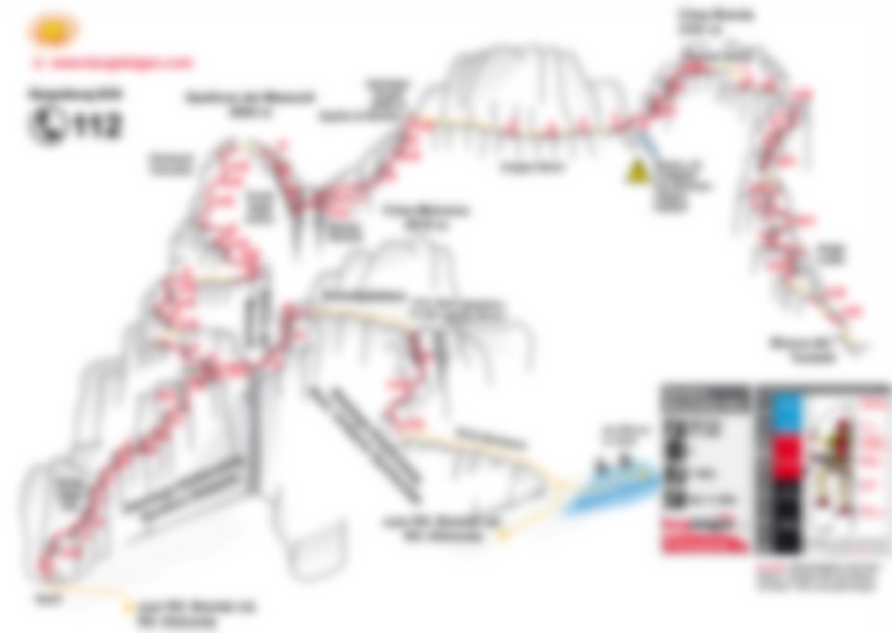 Vom Einstieg steigt man zuerst gestuft (A/B) über Absätze bis zu einer langen Leiter (A/B). Danach wechseln kurze, tlw. recht steile Stufen (bis B/C) mit Leitern, die zum sog. Garbari-Band führen, knapp unter der 3000er Marke. Über Bandsysteme (A) und Schrofen (1-, bei Schnee heikel!) erreicht man das Ende des Bandes und steigt über eine Leiternrinne (B) in eine Schlucht (Rinne, im Frühsommer bei Schneeresten heikel - siehe Topo) ab. Danach über Bänder (A) bis zum höchsten Punkt (3020 m), dort über Leitern (B) bis zu einem Spreizschritt (A/B). Danach steigt man über die lange Leiter „Scala degli Amici“ (Leiter der Freundschaft) auf und vom Plateau auf 3004 m gestuft, aber nicht allzu schwierig (bis B) zu einem Band ab. Eine Querung und Leitern (bis B) leiten den Abstieg ein. Eine Leiter nach der anderen (B) wird bis zur Abzweigung in die Bocca dei Massodi (Tafel) abgestiegen. Dort zwei Möglichkeiten: