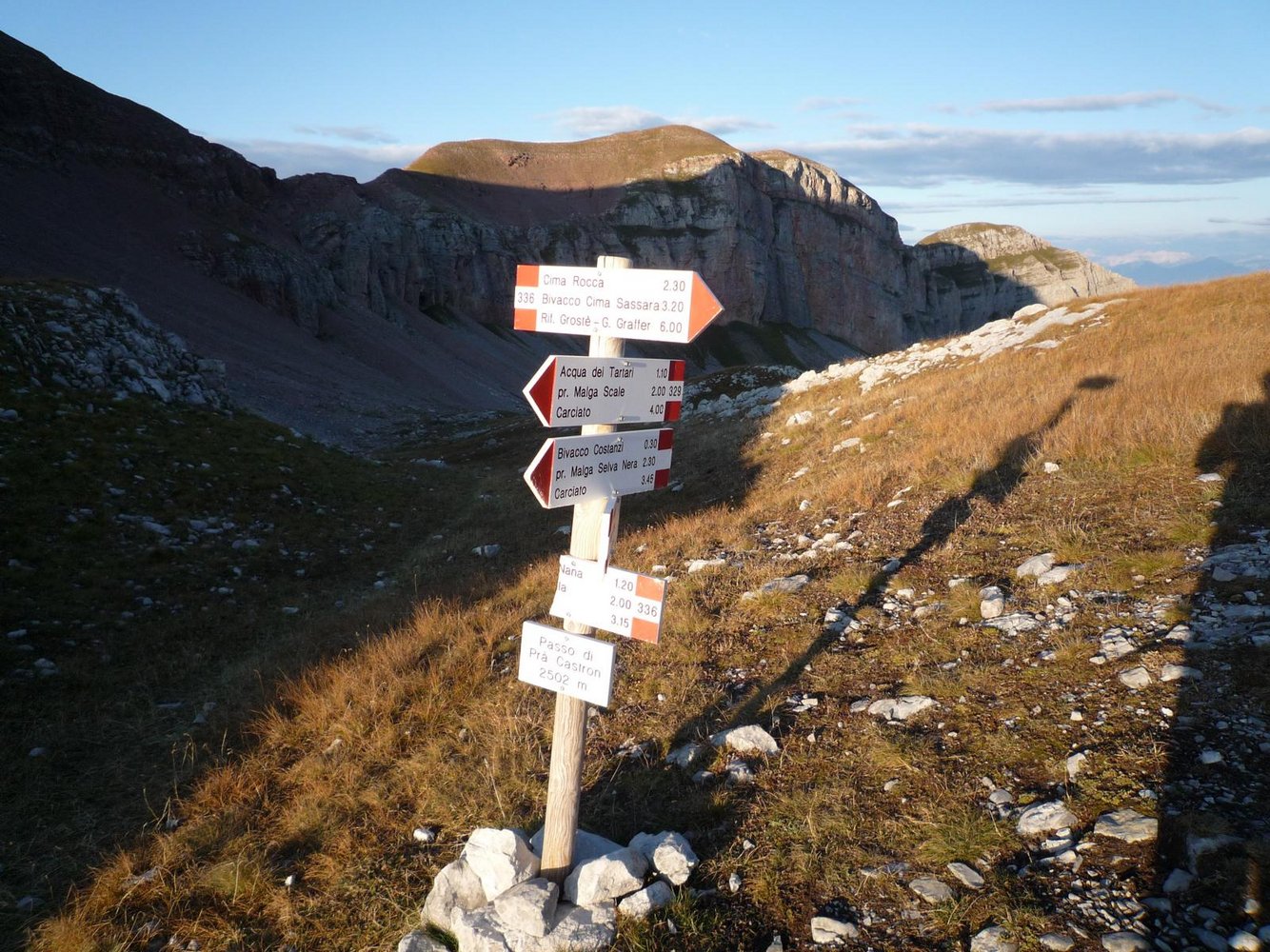Vom Passo di Val Gelada in nördlicher Richtung über eine Geröllhalde aufwärts zu den ersten Versicherungen mit Leiter (A/B), die zum Sasso Alto (A) hinaufführen. Von dort steigt man leicht ab (A) und quert unter den Sassara Gipfel, 2892 m – Gipfelabstecher + 10 Min. – zum Bivacco della Cima Sassara (auch Bivacco Bonvecchio genannt), 2779 m. Es folgt der Abstieg (A) in die Scharte und der Wiederaufstieg (A/B) an der Ostseite auf den Paradiso- und Rocca Gipfel. Vom Rocca Gipfel entlang des Gebirgskammes (anfangs leicht), dann vor der Scharte (B/C – schwierigste technische Stelle) absteigen und Wiederaufstieg (A) zur Bocchetta delle Livezze. Weiter über den Vento Gipfel (A) auf dem Wanderweg zum Tuena Gipfel und stets dem Gratrücken folgend über den Monte Benon zum Pra Castròn Pass, 2505 m, auf dem der schwierige Teil der Strecke endet.