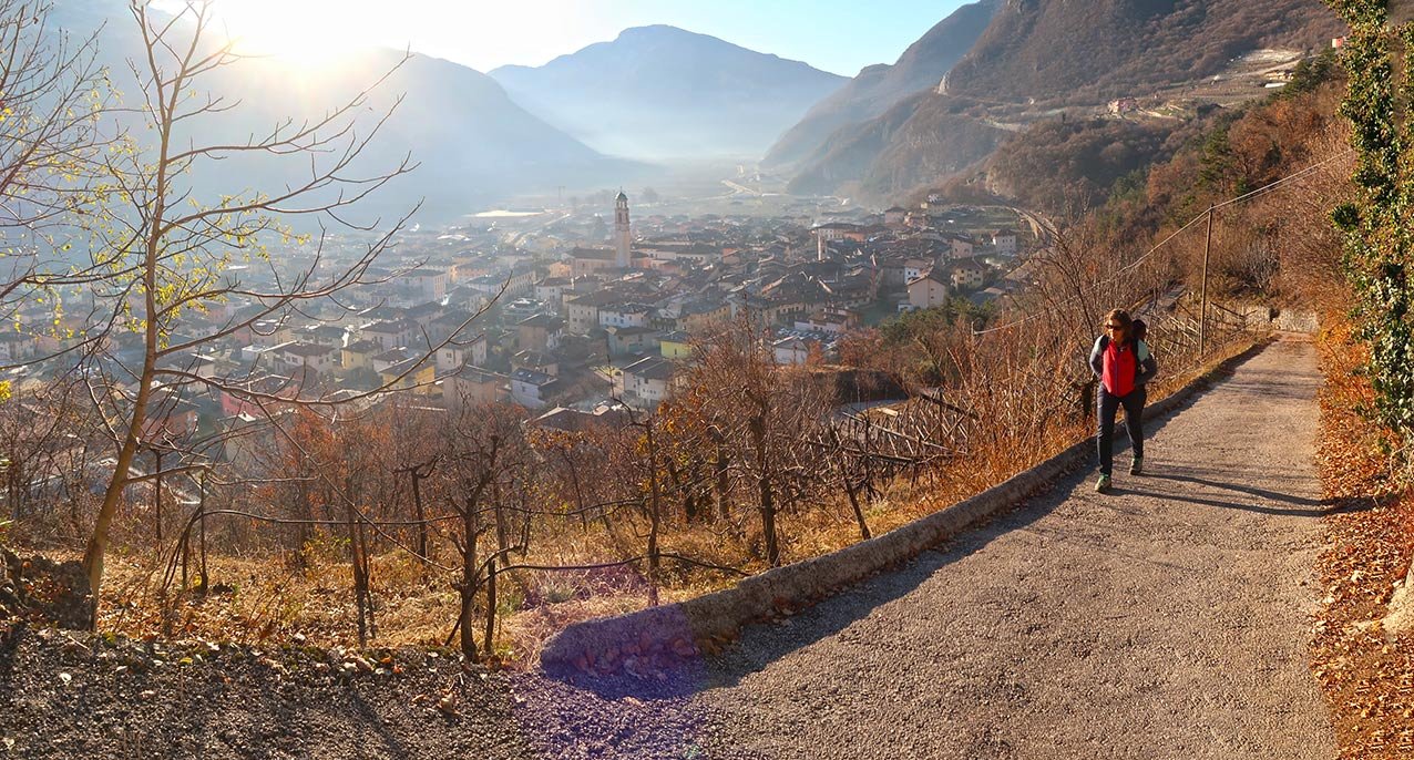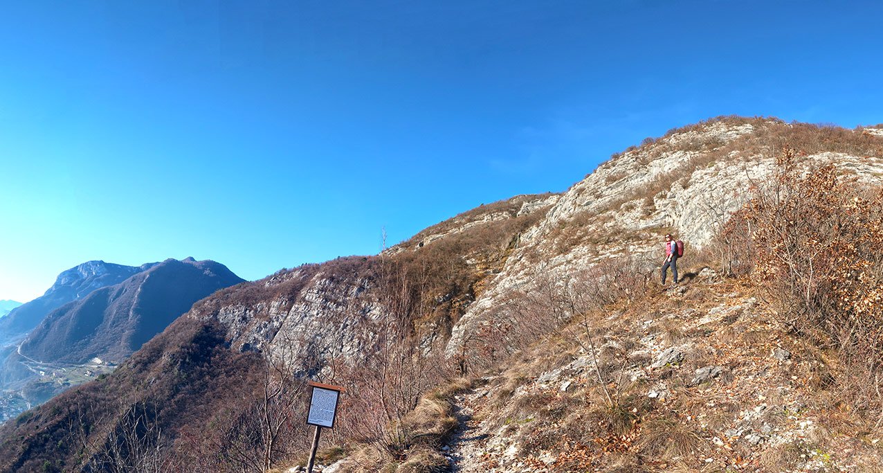 Vom Aussichtspunkt auf dem Pfad hinauf zur Forststraße. Dort links in Richtung La Peschiera, bei der Kriegsstellung wieder hinunter nach Aldeno, nach einer versicherten Felsstufe (max. A) trifft man auf den bekannten Aufstiegsweg und steigt auf diesem nach Aldeno ab. Alternativ geht man oben auf dem Forstweg nach rechts und schaut sich noch die Kirche S. Osvaldo in Garniga Terme an und steigt von dort ab (ca. 30 Minuten Mehraufwand).