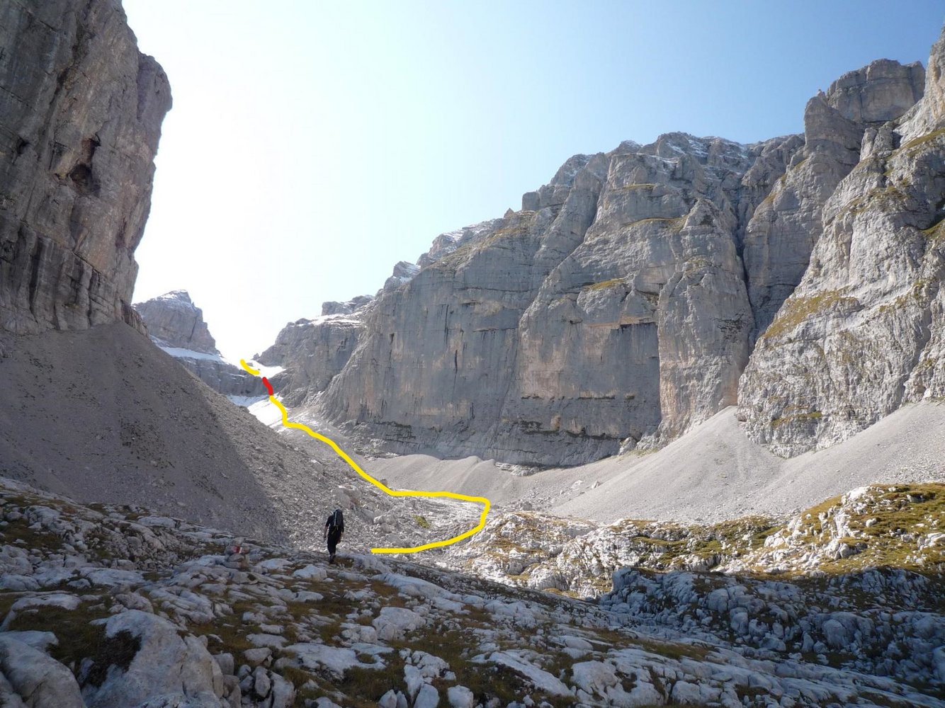 Den Einstieg erreicht man über Sent. d. Palete (B) - Pso. di Palete, 2317 m. Abstieg in die Livezza Grande und bevor man auf den Wiesenboden kommt links über ein kleines Weglein zur Felsstufe. Bei schlechter Sicht besser ganz absteigen und links über die Wiesen zum Einstieg.
