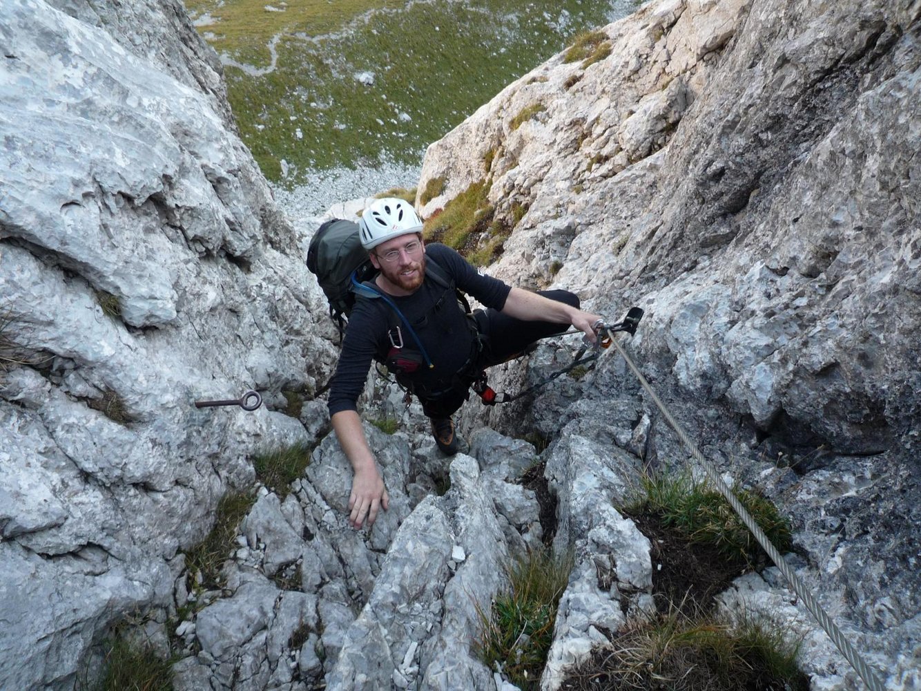 Komplette Klettersteigausrüstung und Helm.