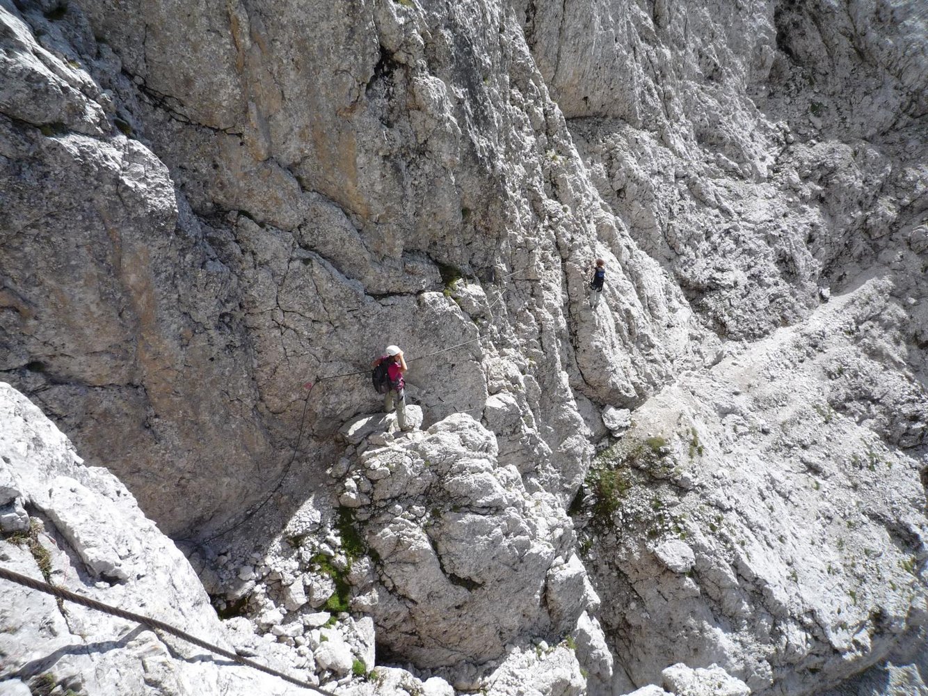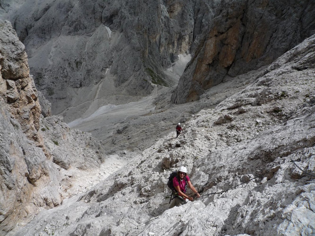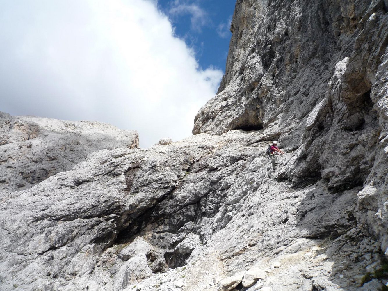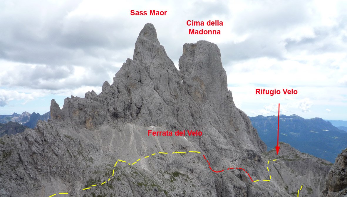 3) Geradeaus dem Weg 739, Via ferrata del Velo (B/C) unter die Cima d. Madonna folgen. Anfangs ein gutes Stück im Gehgelände, bis bei einer Platte die Versicherungen beginnen (N46.23411, E11.84558). Man steigt neben einer Rinne auf ein Band ab (A/B) und quert zu einer Plattenzone, die man im Abstieg (B/C) zu einem weiteren Band überwindet; Ende der Versicherungen. Weiter unschwierig zu dem nahe gelegenen Rif. Velo.