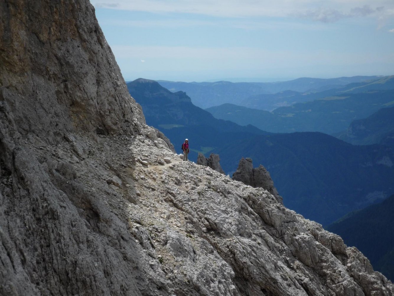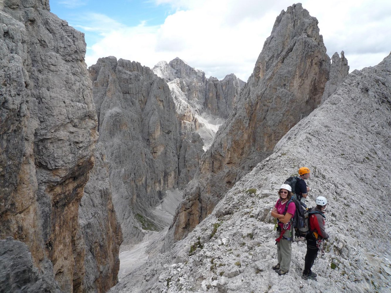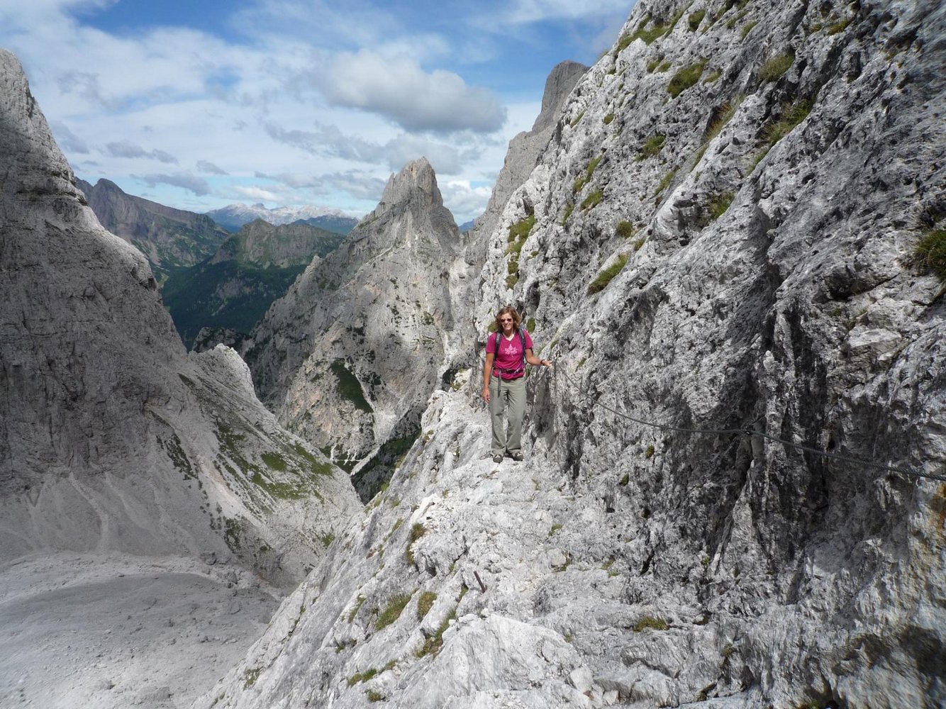 3) Geradeaus dem Weg 739, Via ferrata del Velo (B/C) unter die Cima d. Madonna folgen. Anfangs ein gutes Stück im Gehgelände, bis bei einer Platte die Versicherungen beginnen (N46.23411, E11.84558). Man steigt neben einer Rinne auf ein Band ab (A/B) und quert zu einer Plattenzone, die man im Abstieg (B/C) zu einem weiteren Band überwindet; Ende der Versicherungen. Weiter unschwierig zu dem nahe gelegenen Rif. Velo.