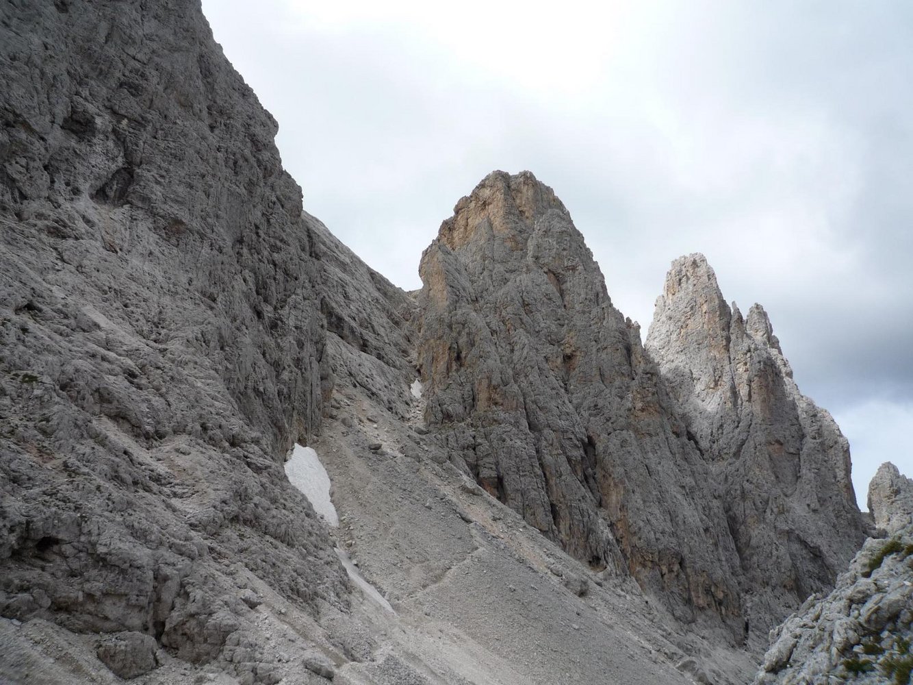 Mit der Seilbahn zur Rosetta auffahren, zur gleichnamigen Hütte queren, und auf den Wegen 702 und 715 unter der Pala di San Martino, 2982 m, zum Passo di Ball, 2443 m queren (15 Min. südöstlich darunter liegt das Rif. Pradidali, 2278 m). Kurz vor dem Pass versichert (A). Vom Pass rechts der markanten Felsnadel, direkt oberhalb des Passes, einen Geröllhang (Weg) zum Einstieg in eine Rinne hinauf.