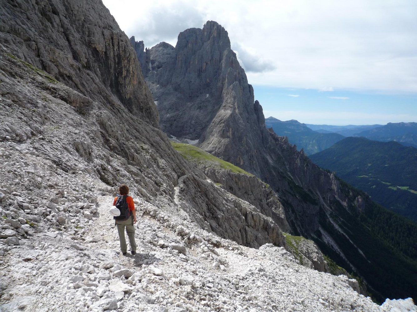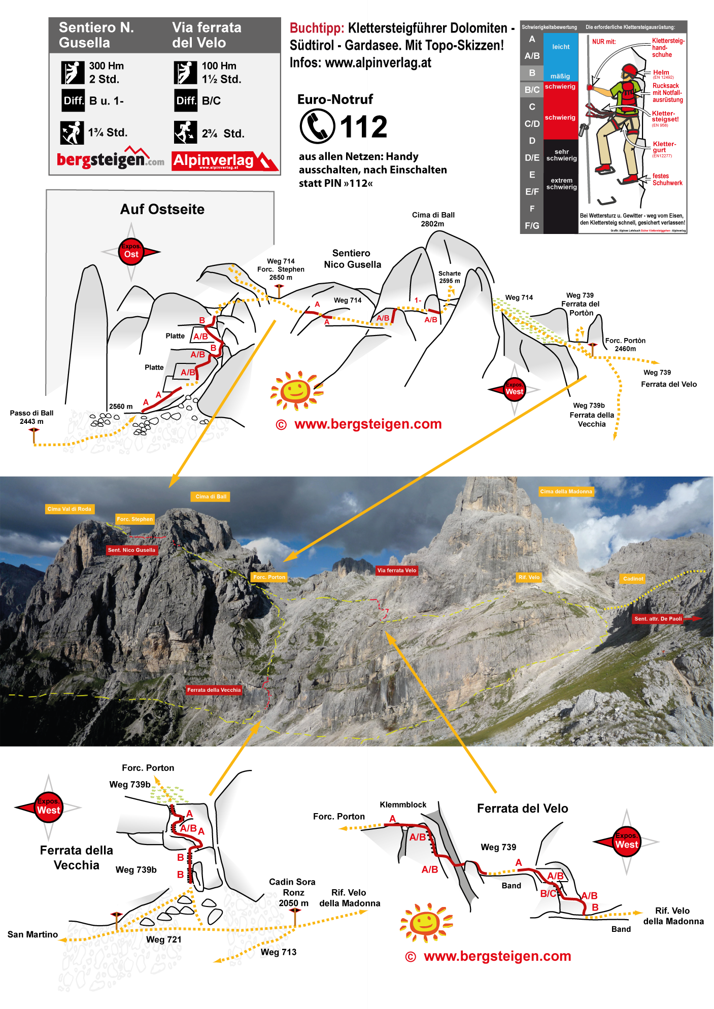 Sentiero Nico Gusella (B): Links der Rinne anfangs gestuft (A), dann über Platten bis zu einem kleinen Aufschwung (B). Danach in einem Linksbogen plattig (A/B, B) in die Forc. Stephen, 2650 m. Dort kann man unschwierig eine Stichtour auf die Cima Val di Roda, 2791 m, unternehmen (15 Min.). Der Steig führt auf der Westseite leicht Richtung Süden hinab, ist dort nur an wenigen Stellen (A, A/B) versichert und verlangt in diesem Bereich 100%ige Trittsicherheit. Es folgt ein Aufstieg in eine Scharte (A/B u. 1), wo die Versicherungen enden (N46.24114, E11.84240). Dort hat man erstmals einen imposanten Blick auf das Traumpaar, Sass Maor und Cima d. Madonna und auf die darunter liegende Ferrata Velo. Steil über Wiesen und Geröll hinunter in die Forc. Porton, 2460 m (Tafel; N46.23933, E11.84675). Dort drei Möglichkeiten: