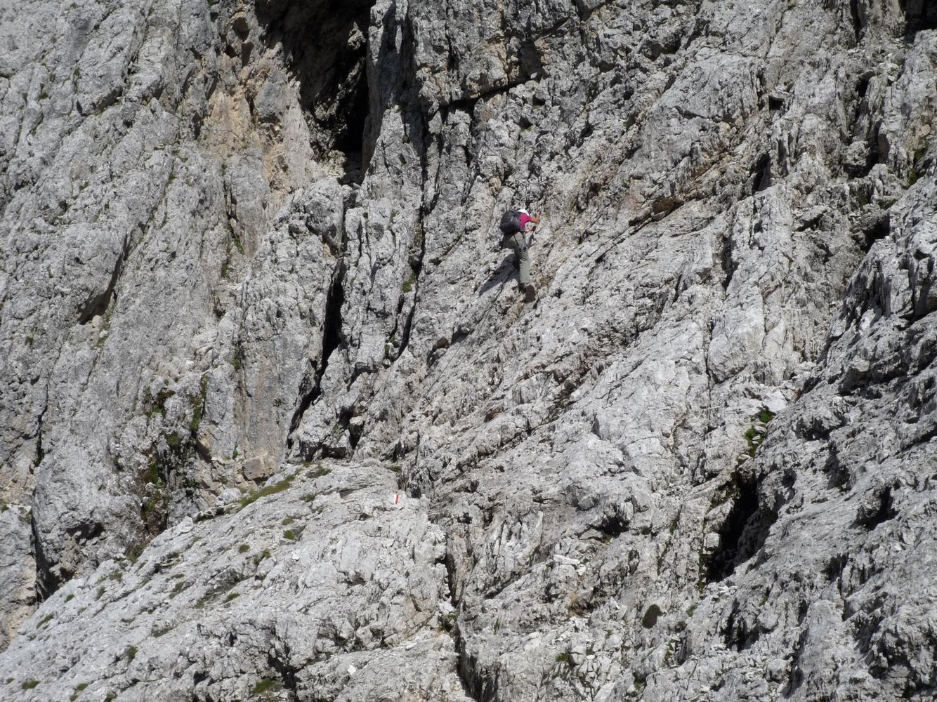 1) Rechts auf dem Weg 739b hinunter zur Via ferrata della Vecchia (B) (alte und von oben schwierig zu findende Versicherungen, siehe Topo)
