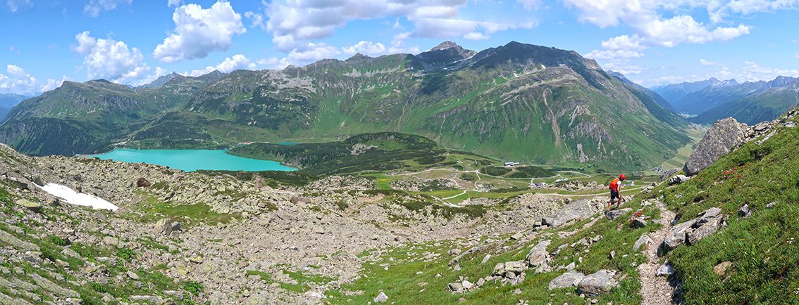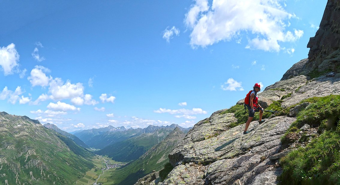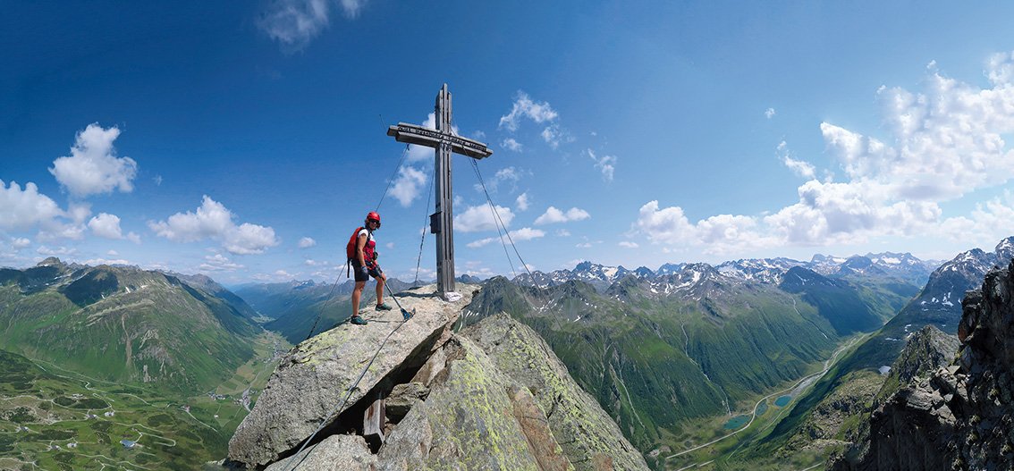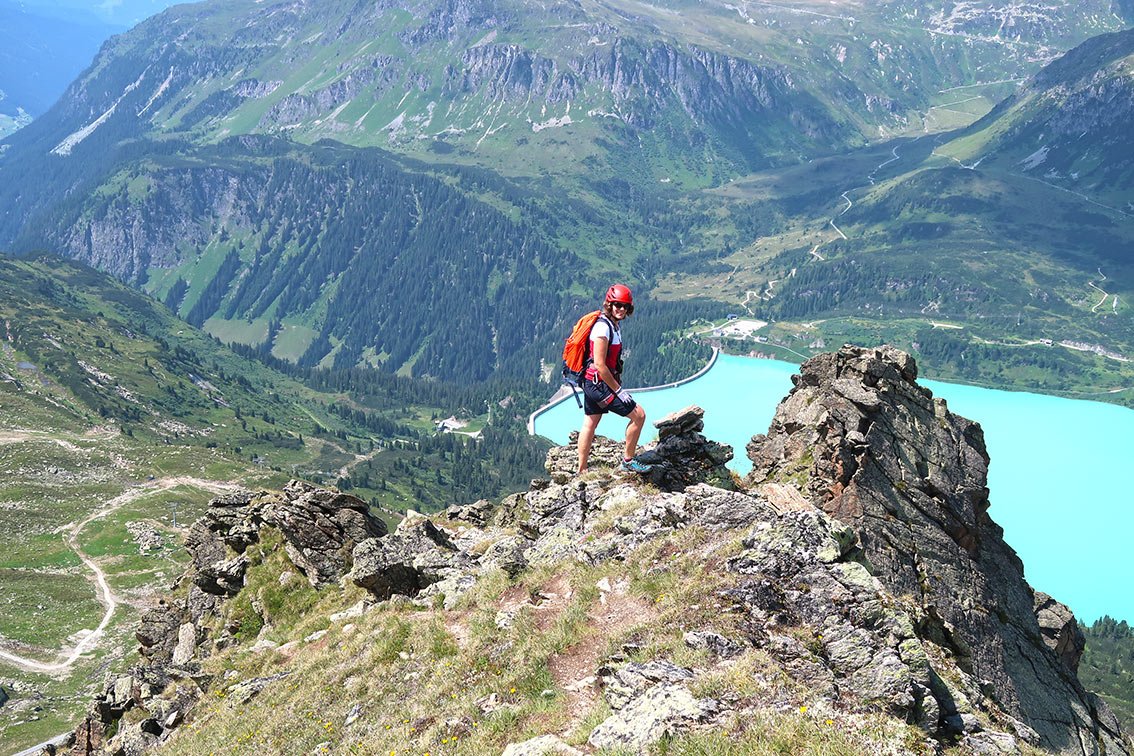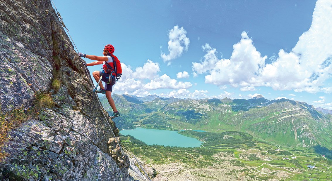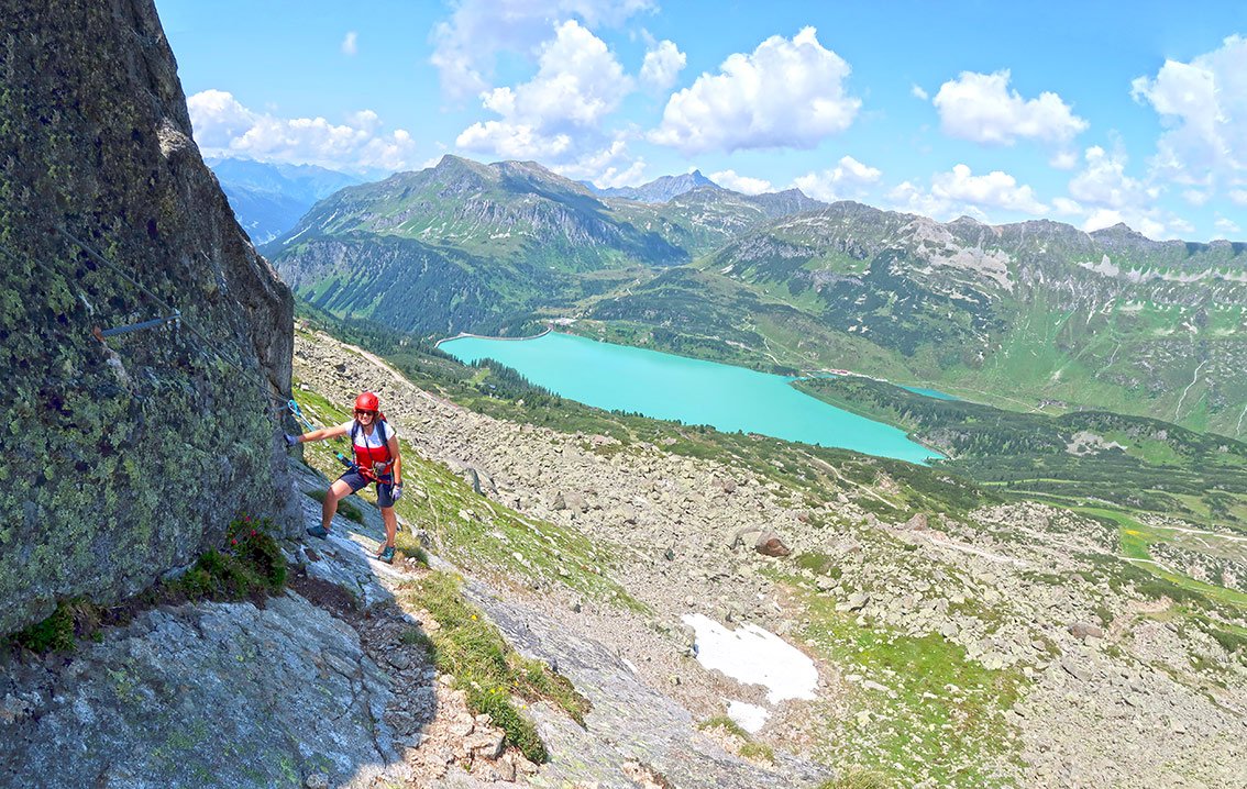 Schöner Urgesteinsklettersteig auf den aussichtsreichen Grenzberg zwischen Tirol und Vorarlberg. Der Klettersteig wurde geschickt durch die zentrale Nordwand gelegt. Vom Gipfel genießt man den Ausblick in die Gletscherwelt der Silvretta bzw. zu den schroffen Felstürmen des Rätikons. Im Tal rundet der türkisfarbene Kops-Speichersee das Landschaftsbild positiv ab.