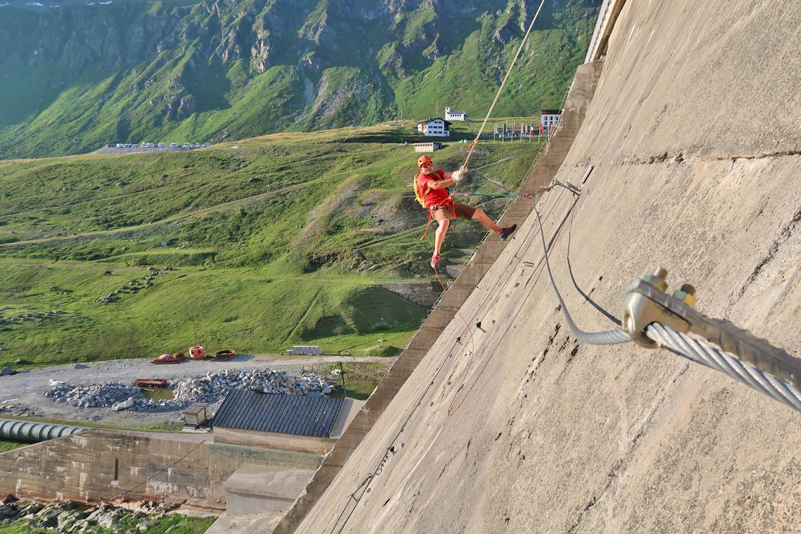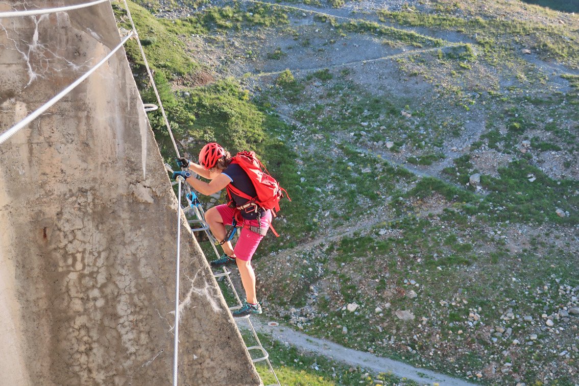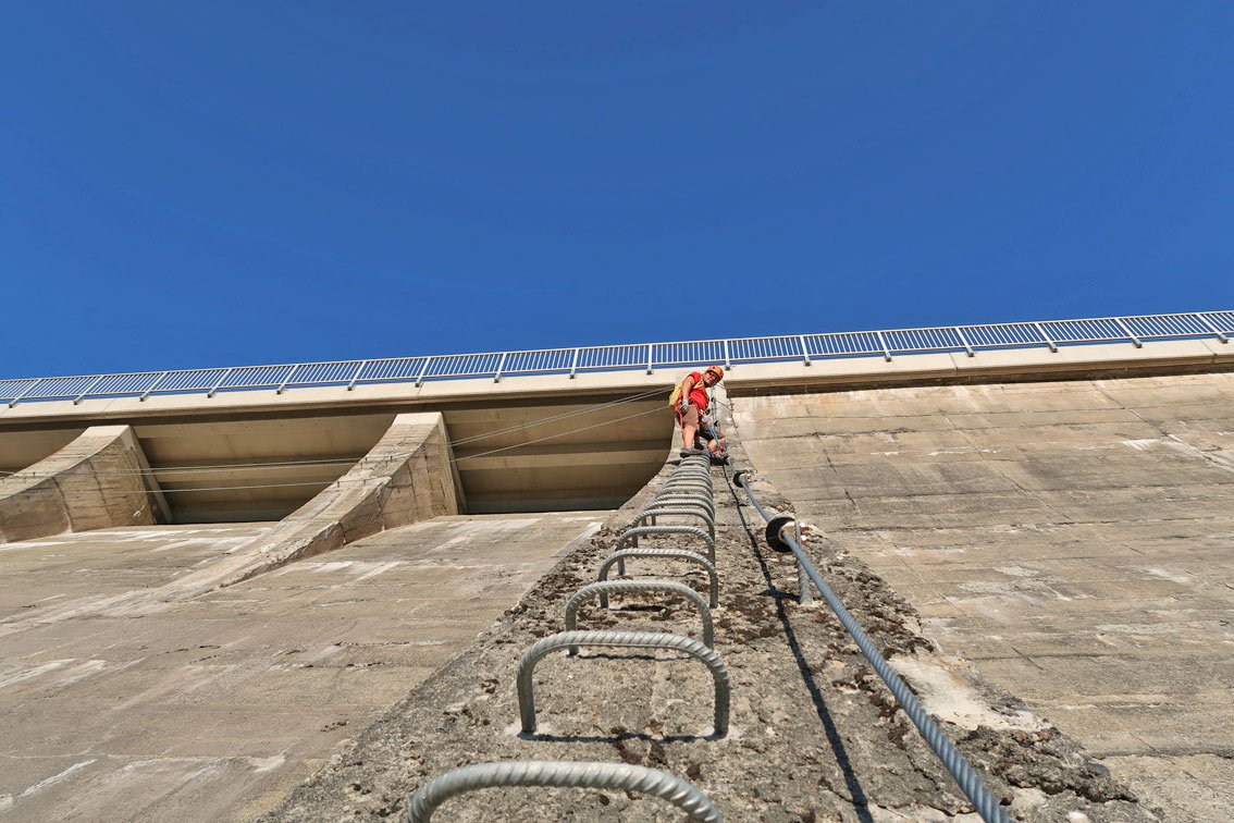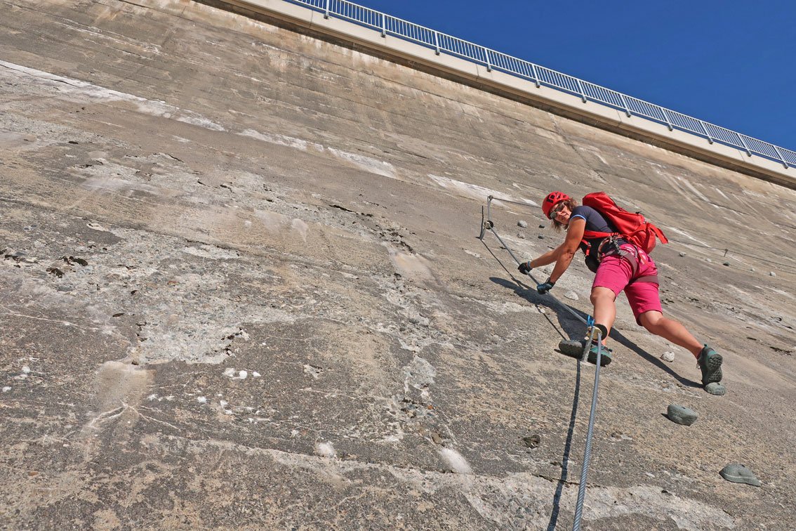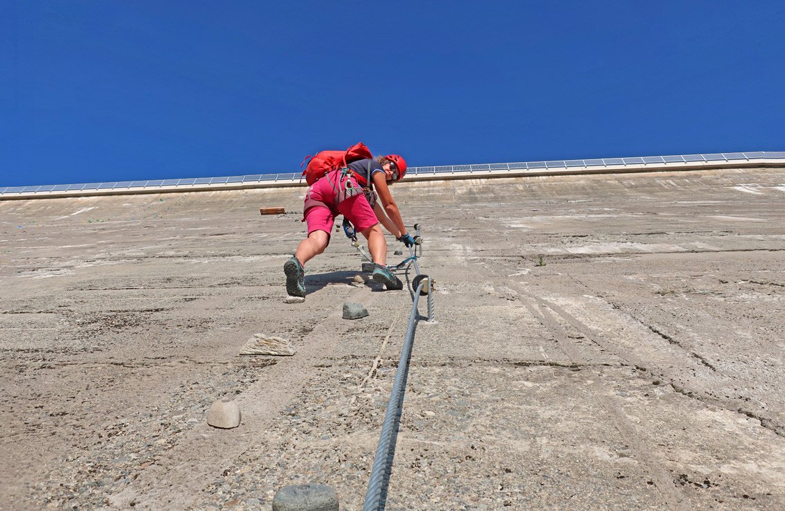 Der Klettersteig verläuft im zentralen Teil der Silvrettasee Staumauer. Infotafel vor Ort und Bemerkung zum Schwingpendel beachten!