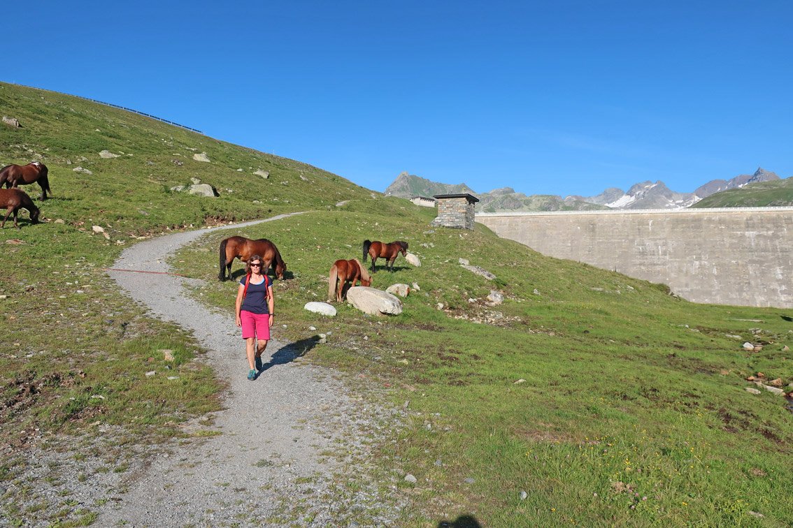 Vom Parkplatz auf dem Pfad die Wiese hinunter zum Einstieg an der Staumauer.