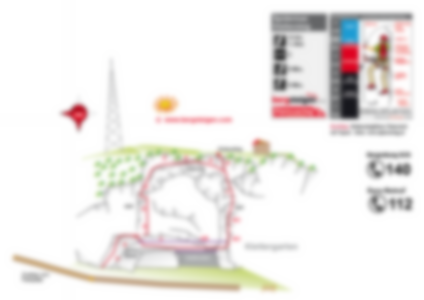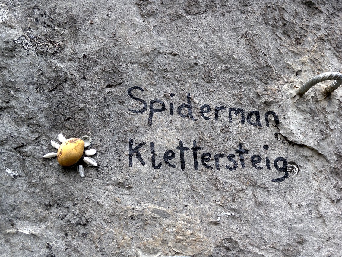 Über den Block (B) zur Wand, steil hinauf (C) bis oben nach rechts gequert wird (B, am Ende der Querung ist auch ein Ausstieg auf die Wiese möglich). Dann wieder hinunter (C) und über die Seilbrücke (B) wieder zu Block und über 2 Klammern (A/B) auf den Weg.