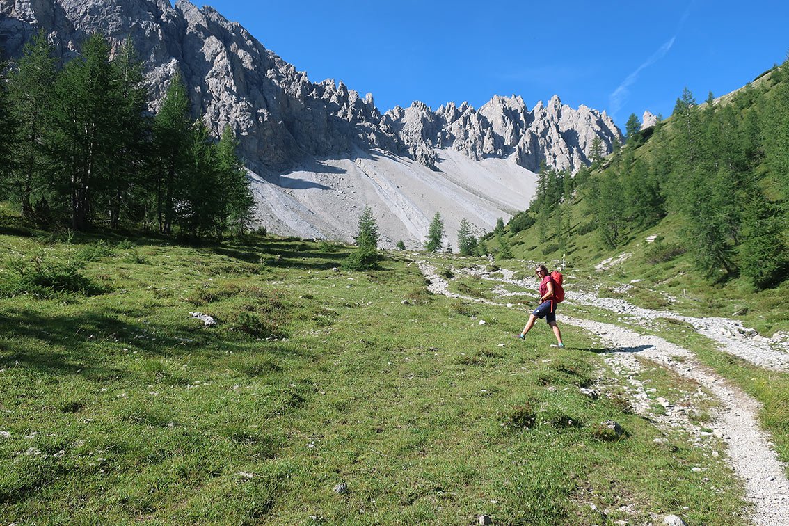 Zuerst durch eine steile Rinne aufwärts (Stellen 1-) und weiter durch die Flanke aufsteigen (markiert). Bei einer erdigen Rampe (Holztreppen, A, weiter in eine Rinne. Dort kurz steil (A/B) aufwärts und weiter zur neu renovierten Linderhütte (2683 m; Biwakhütte). Dort auf dem markierten Steig an die Kante, durch einen Rinne (A) hinunter und über eine kurze luftige Stelle (A/B) abwärts. Man quert (A) in die Gipfelrinne, in dieser (A und gehen) bis zum Gipfel aufsteigen.