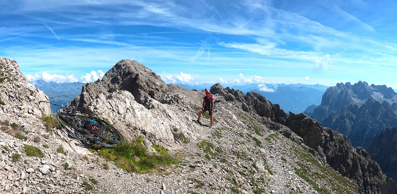 Komplette Klettersteigausrüstung und Helm. Für Unerfahrene ein Sicherungsseil.