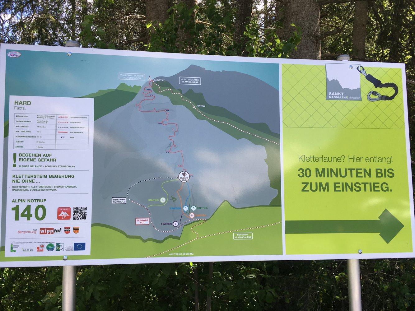 Ein landschaftlicher Hochgenuss, mit einem vertikalen Mittelteil und einer malerischen Bergkapelle zum Ausrasten am Ende - so kann man den St. Magdalena-Klettersteig in einem Satz zusammenfassen. Im Einstiegsbereich dieser Ferrata wurde von der Bergrettung Tirol eine sog. Alpine Safety Area umgesetzt, dort kann man die verschiedenen Klettersteigschwierigkeiten (A - E) und einen roten und schwarzen Bergweg ausprobieren. Danach klettert man vom sog. Habichtblick - ein origineller Aussichtsplatz - über zahlreiche Felsstufen hinauf zur Kapelle St. Magdalena. Gesamt eine wirklich gut umgesetzte Klettersteiganlage, die perfekt in die schroffe Berglandschaft des Gschnitztales passt.
