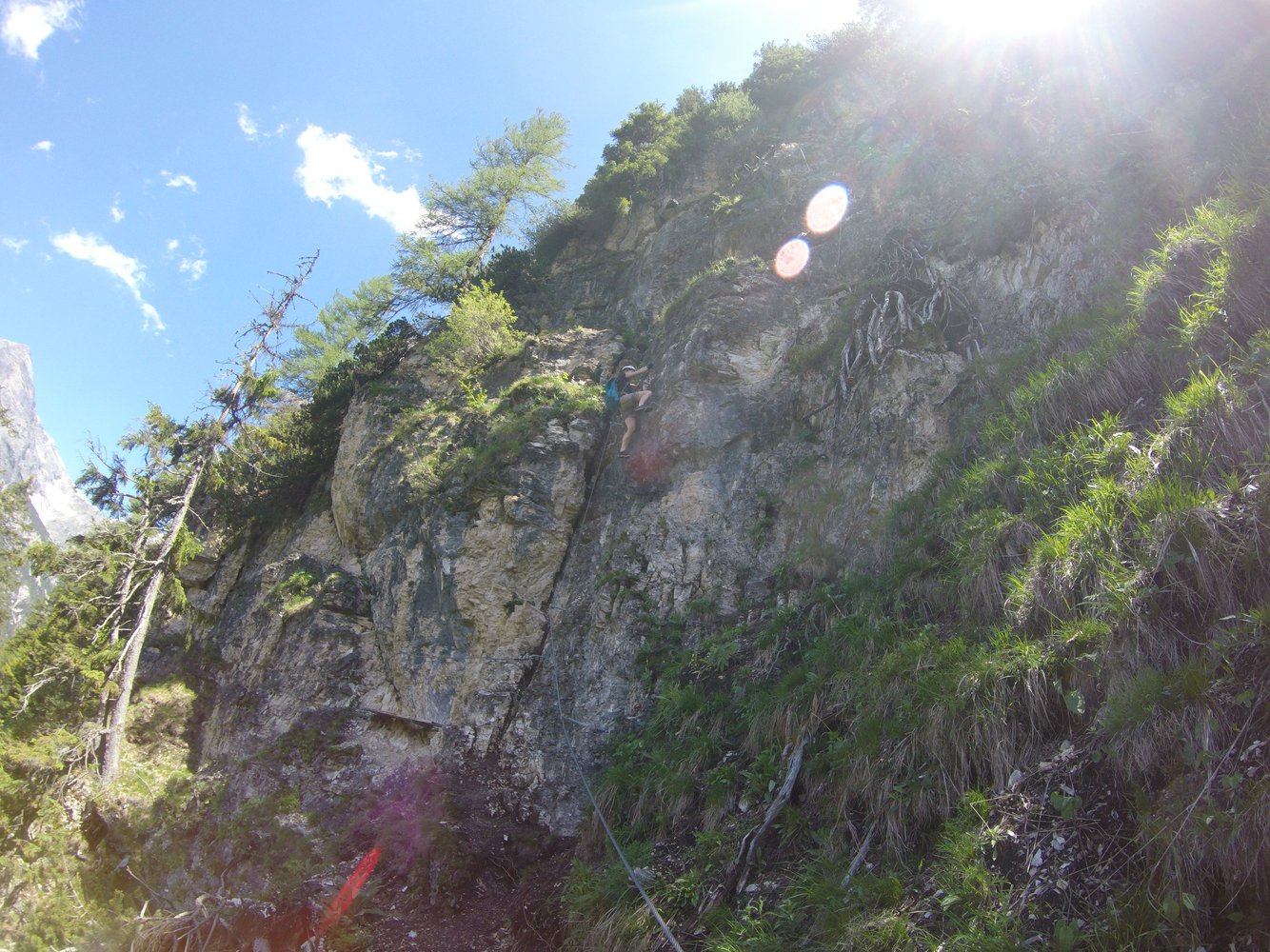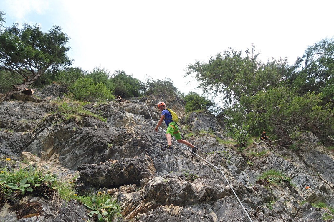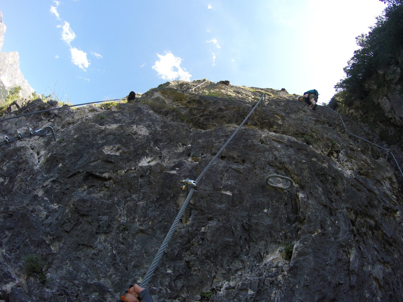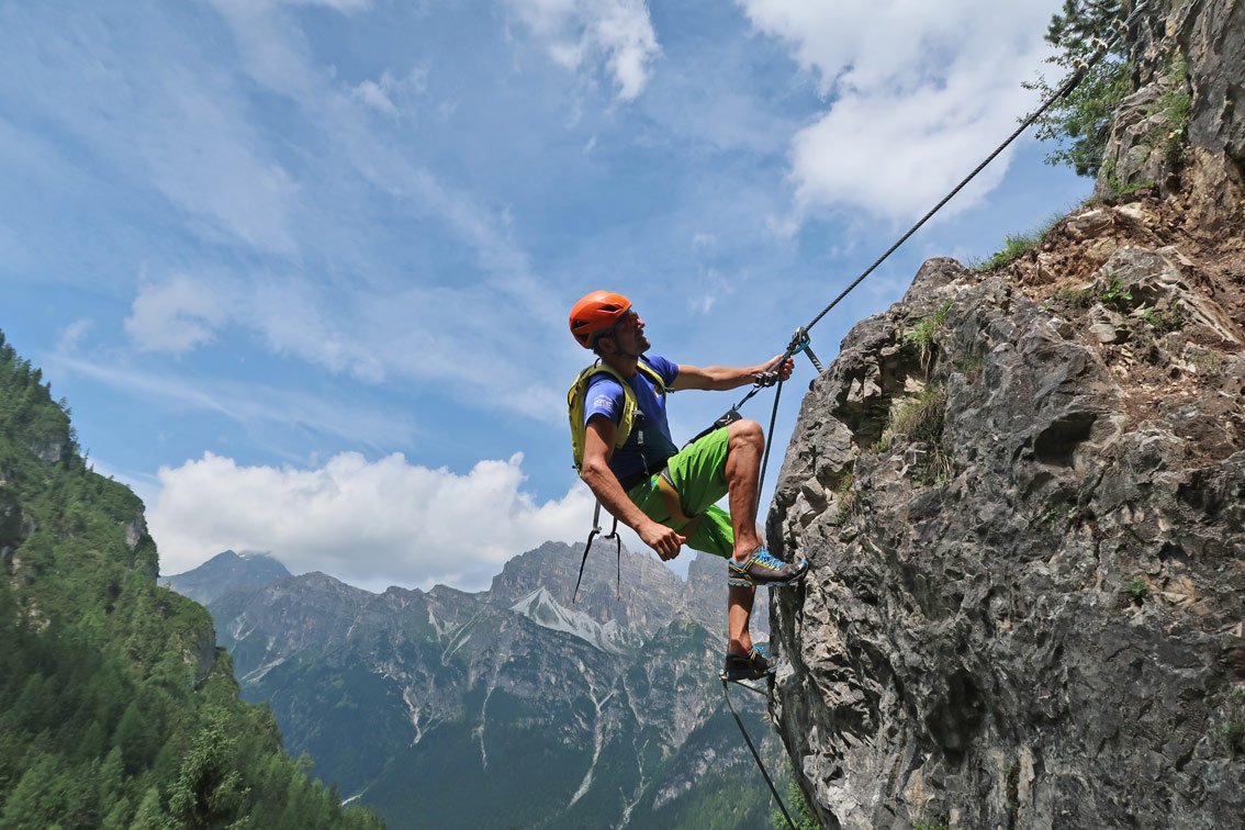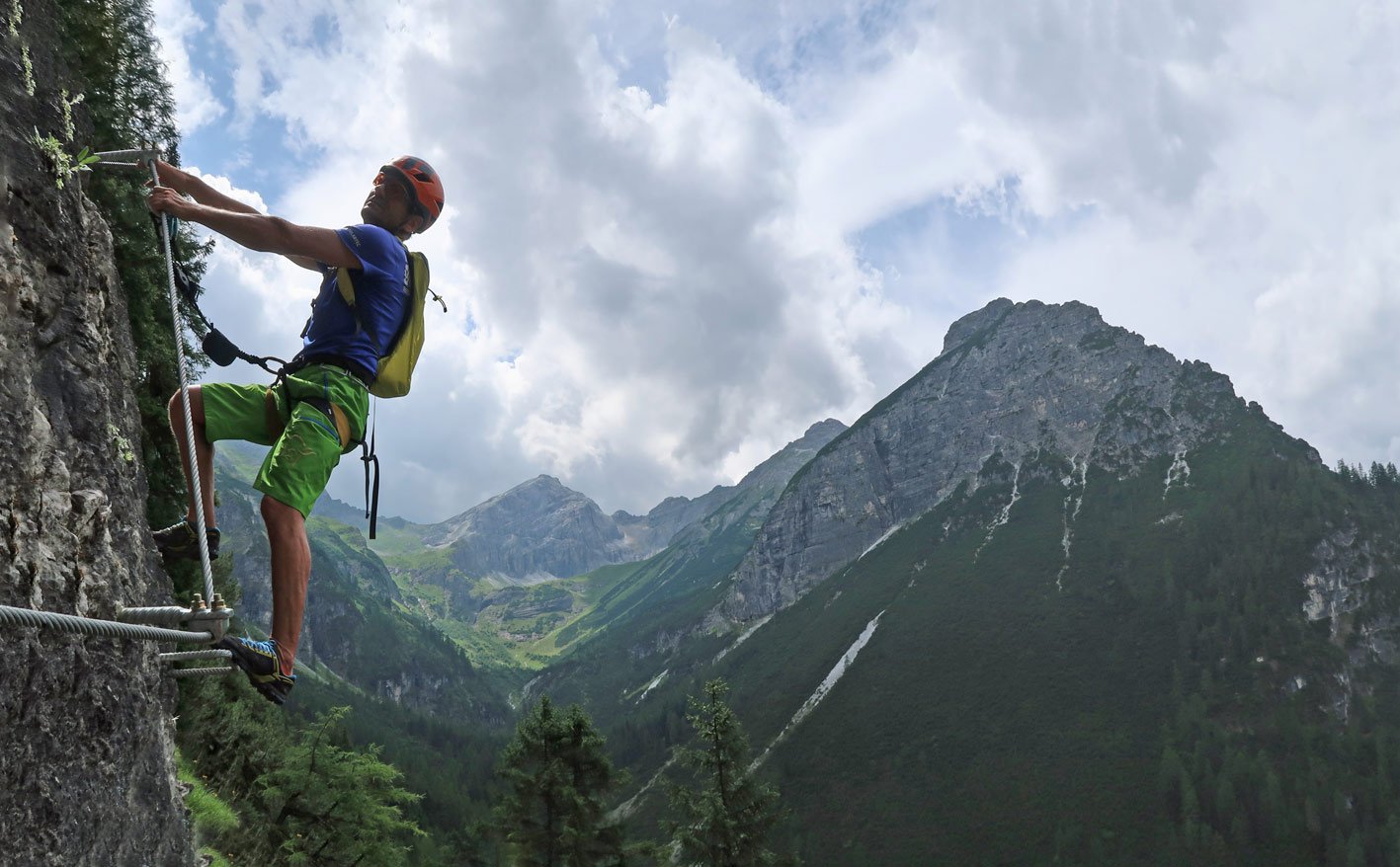 Klettersteigausrüstung und Helm. Für Kinder evtl. ein Sicherungsseil.