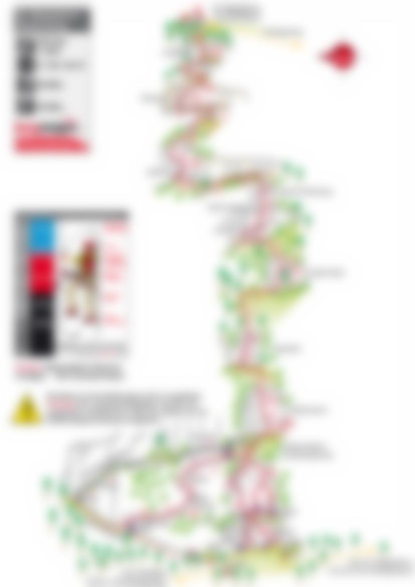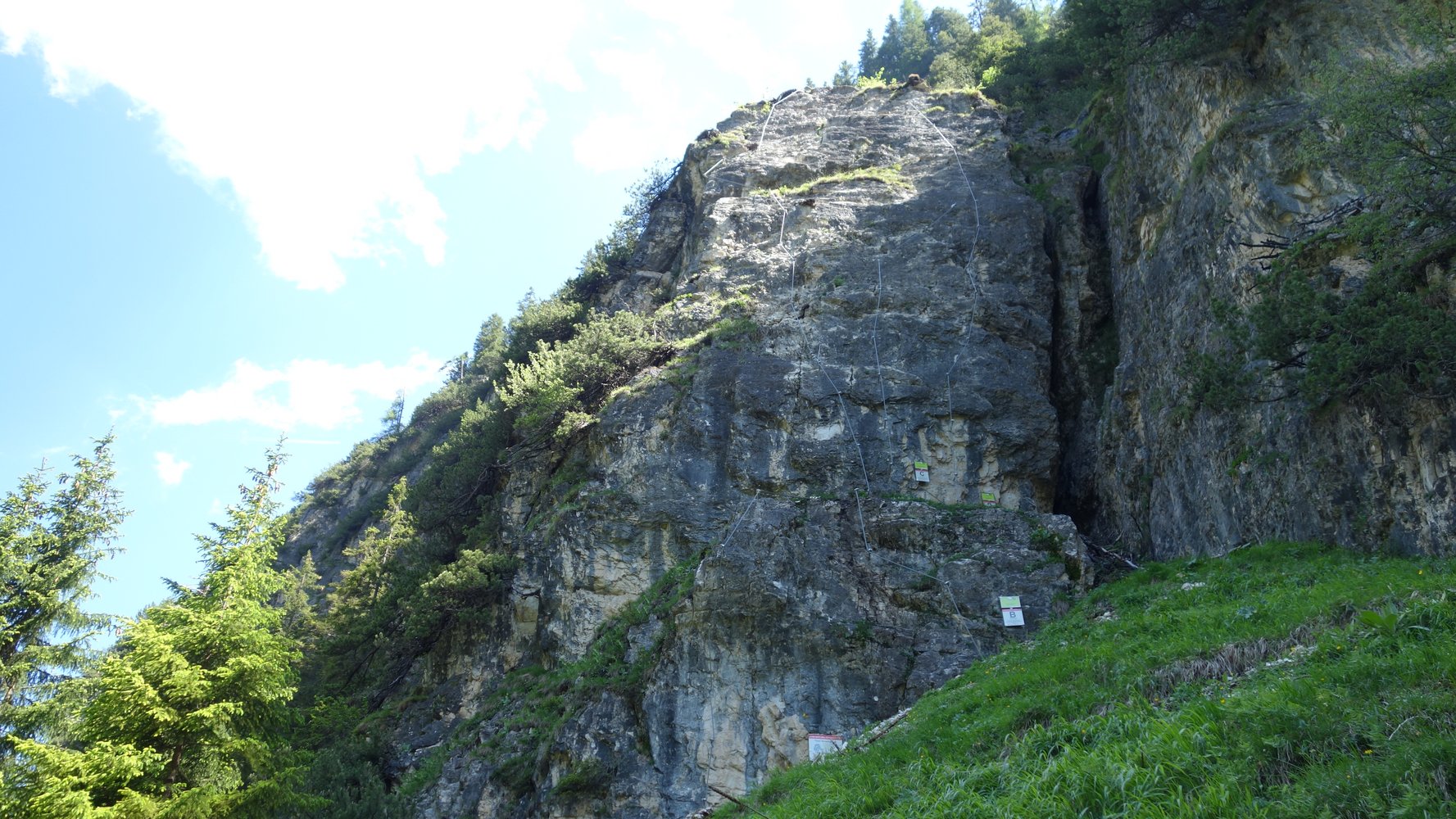 Siehe Topo. Es gibt unten 6 verschiedene Möglichkeiten, um über die erste Steilwand hinauf zum "Habicht Blick" (Aussichtspunkt) zu gelangen. Klettersteige von A-E und einen "Schwarzen Bergweg" (welcher gleich schwer und ausgesetzt ist wie der Klettersteig mit Schwierigkeit A). Vom Habichtblick hinauf zur Kapelle St. Magdalena (C-Passage, meistens B).