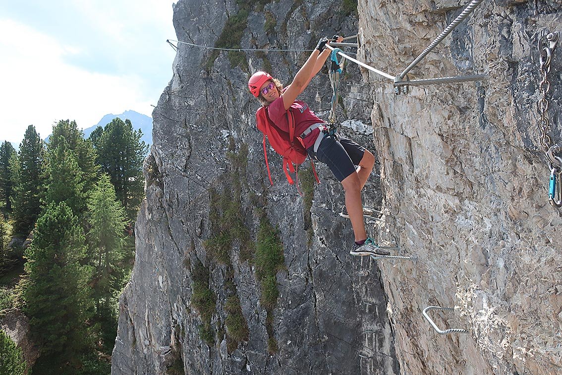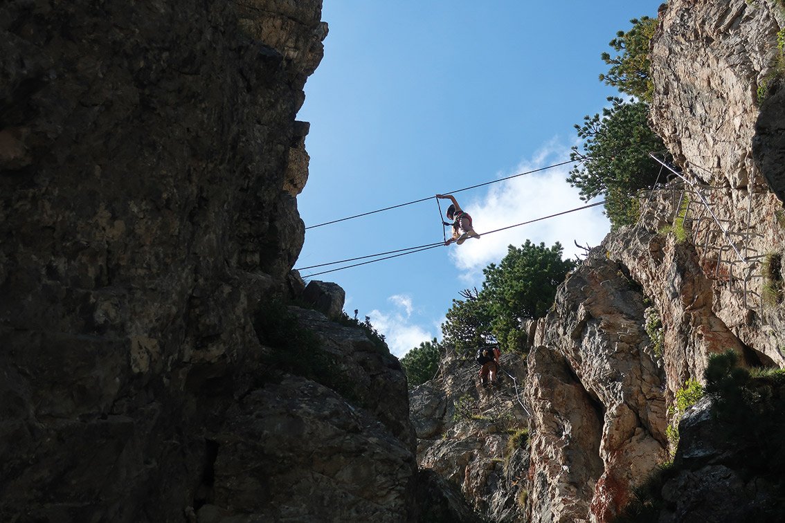 (A/B) und weiter zu zwei Seilbrücken. An deren Ende gerade die Wand hoch (A/B) und kurz vor dem Ausstieg über eine Leiter. Am Grat zum Gipfelkreuz. Abstieg wie Steinbock-Klettersteig.