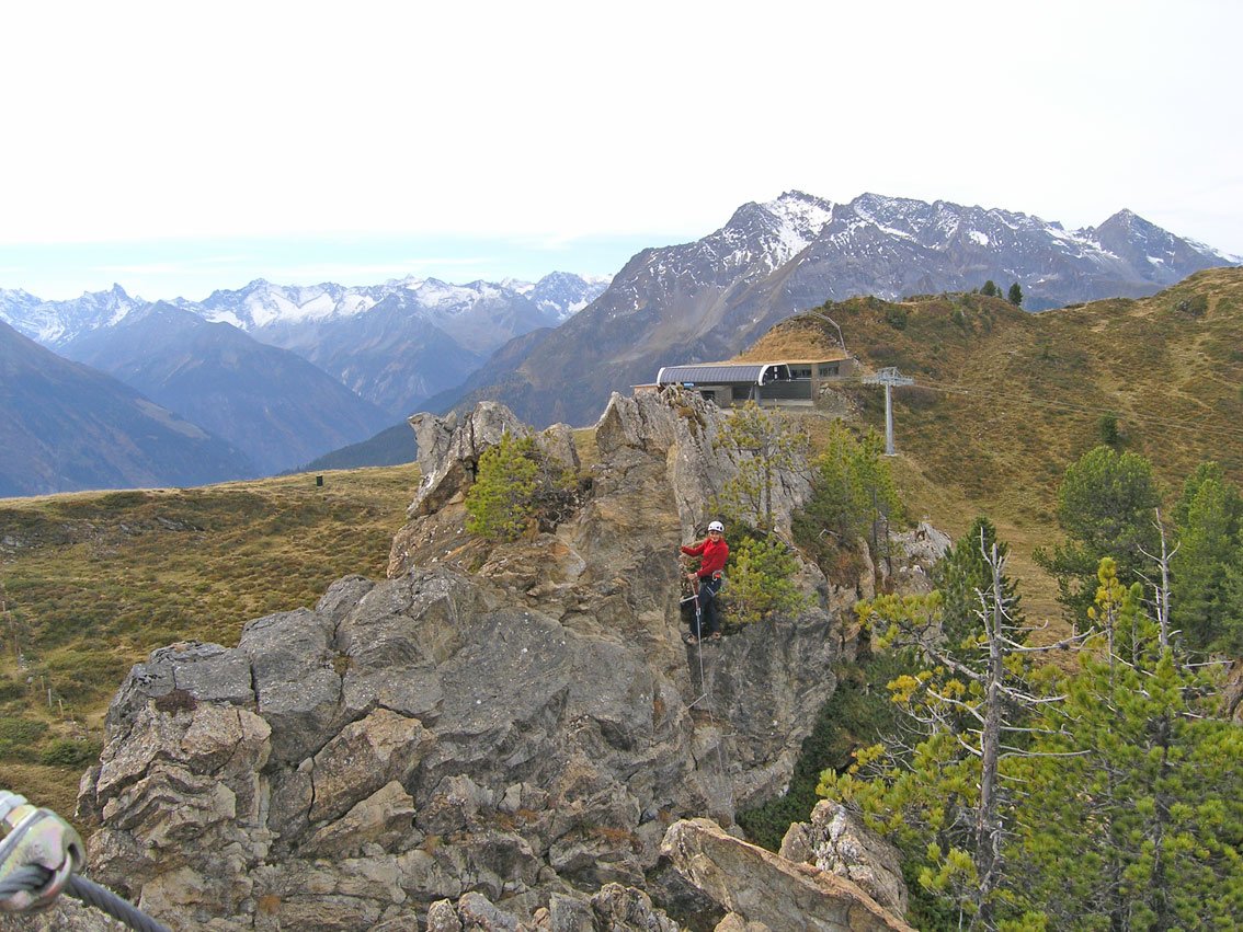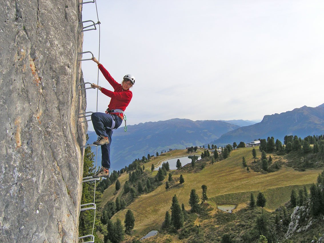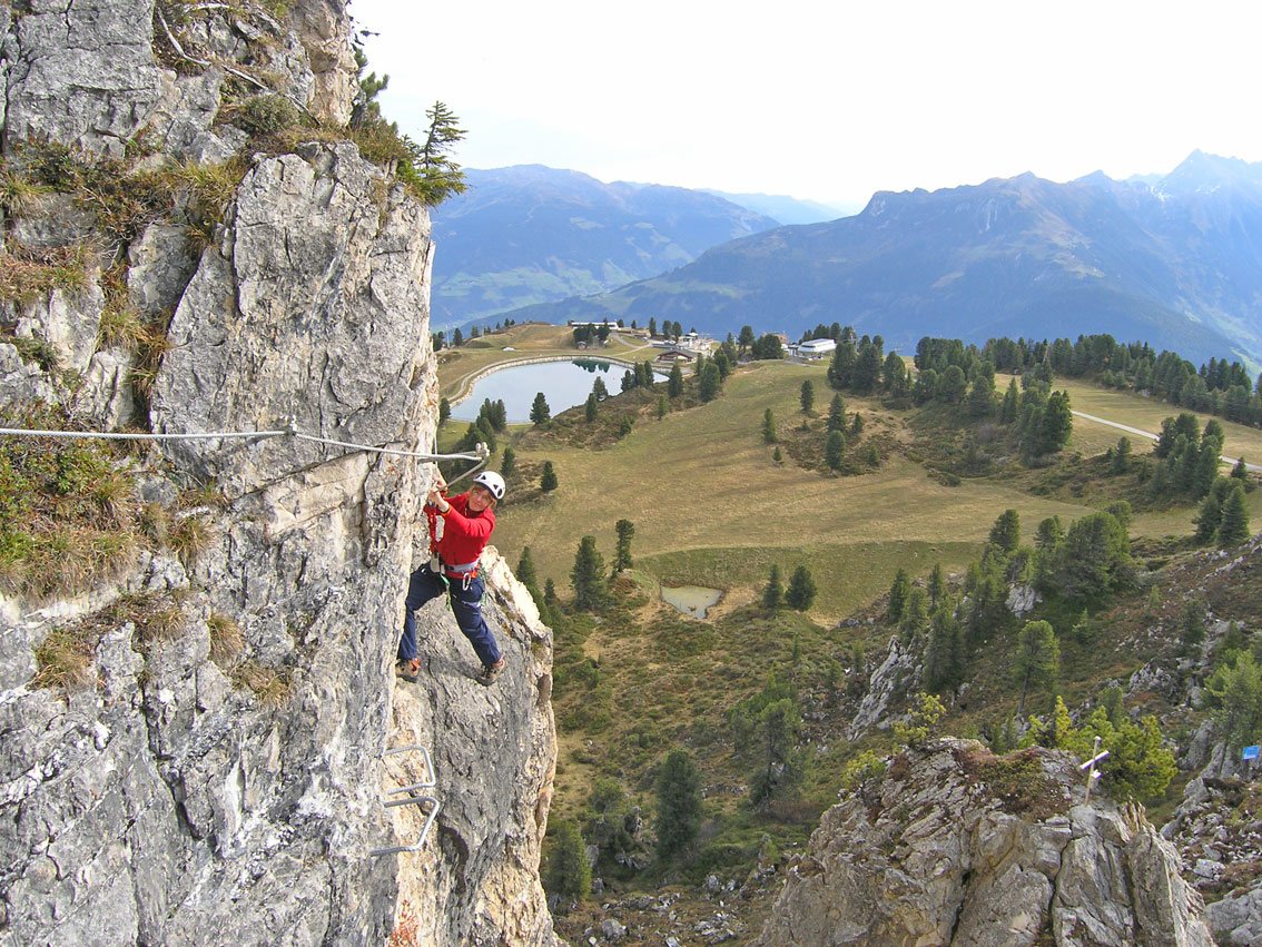 Zwei kurze, aber nicht uninteressante Übungsferratas mit Ausblick zu den Eisriesen der Zillertaler Alpen. Den Knorren kann man in drei Varianten „bezwingen“ - der mittlereAnstieg ist kühn und ausgesetzt, die linke und rechte Variante sind familientauglich. Bei Auffahrtmit der Bergbahn ist der Steig in Kombination mit einer Wanderung eine schöne Unternehmung.