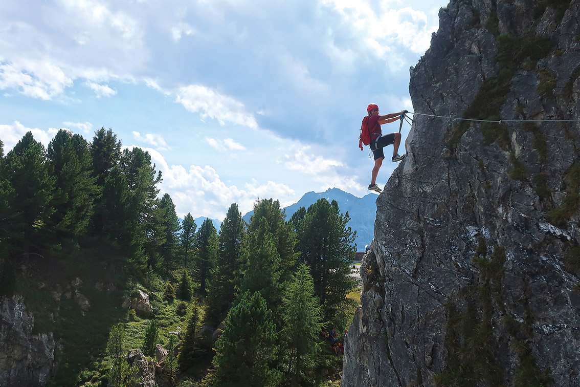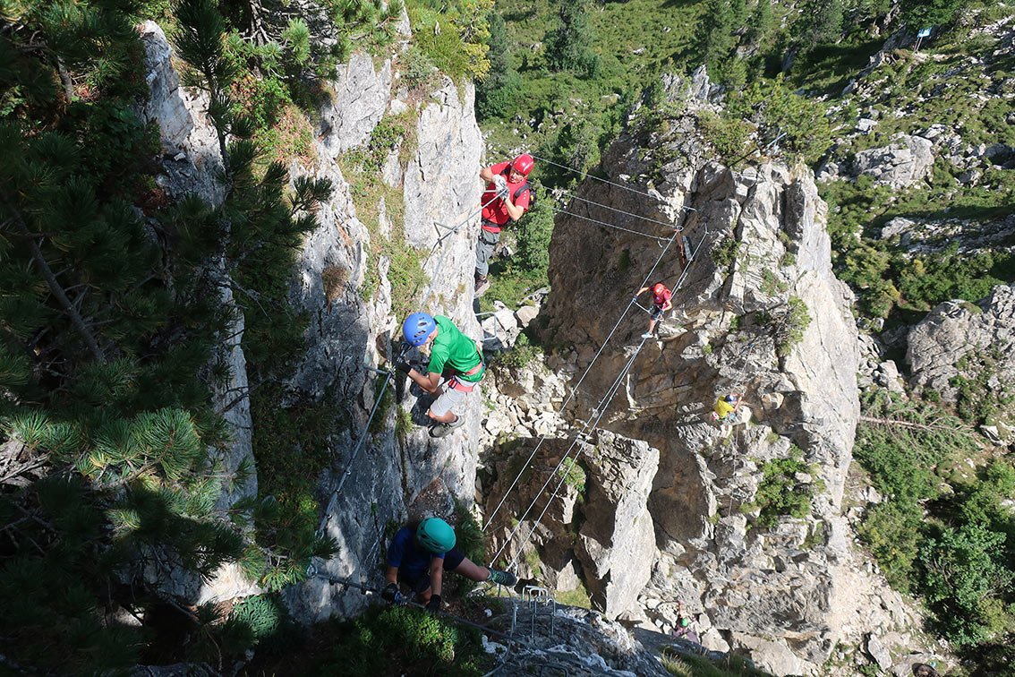 Komplette Klettersteigausrüstung; evtl. Sicherungsseil für Kinder.
