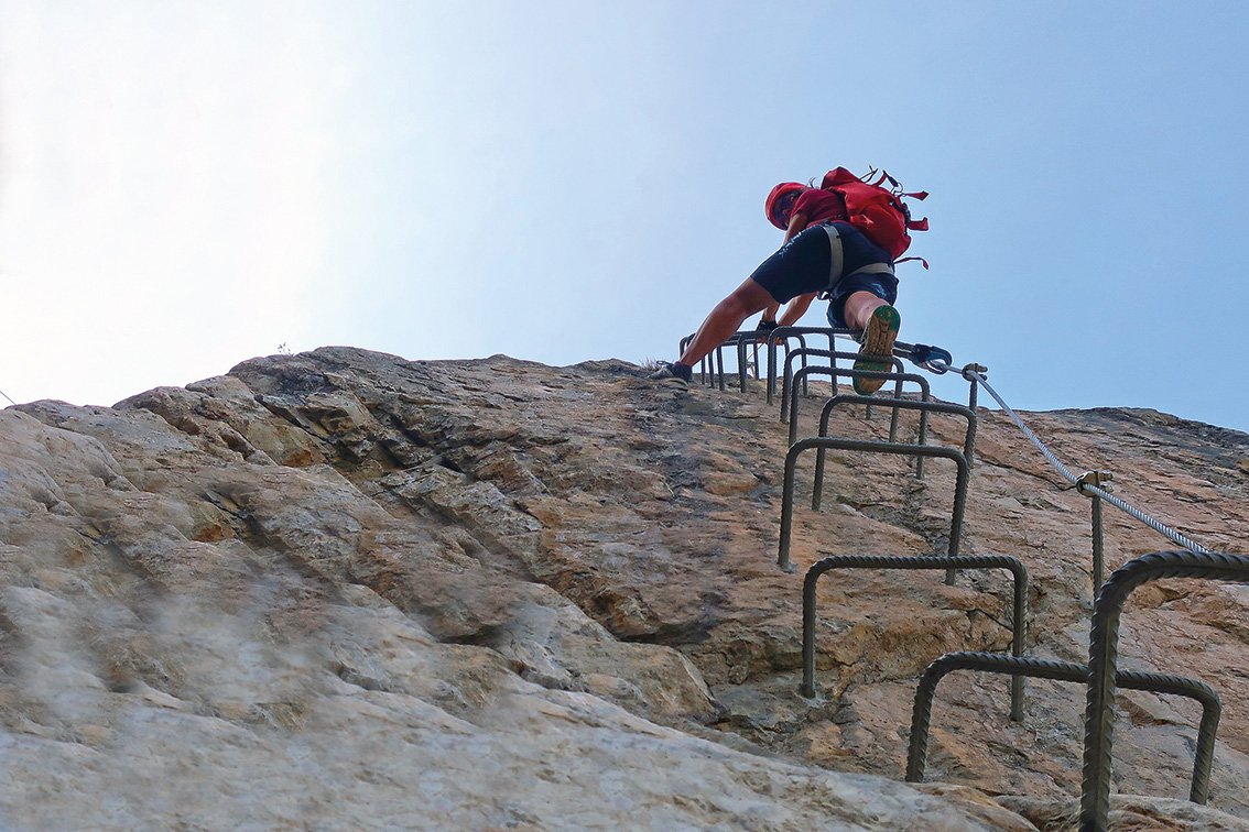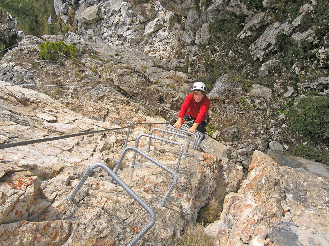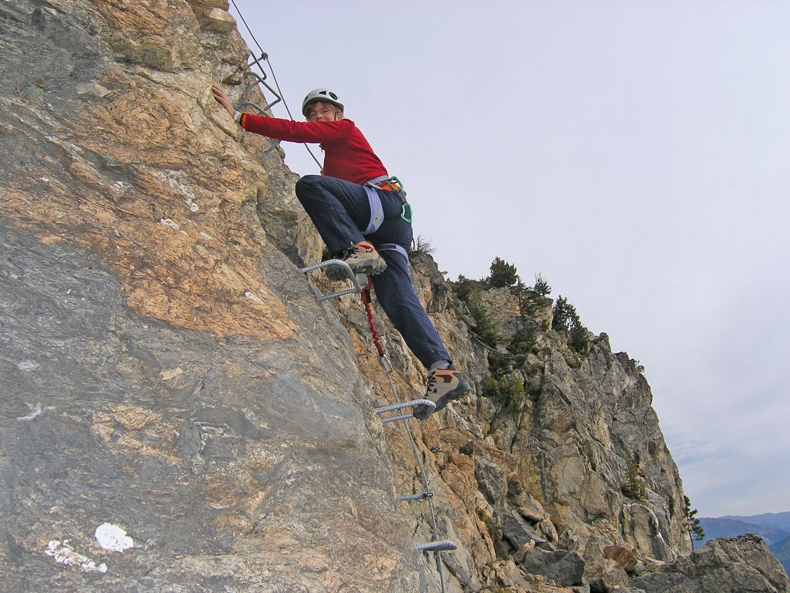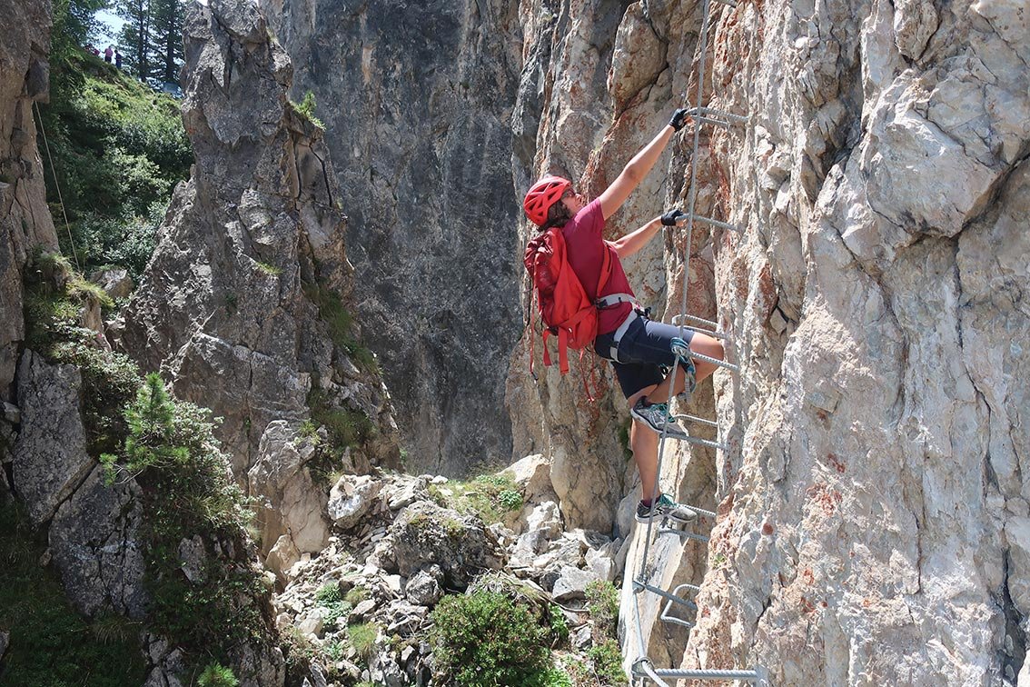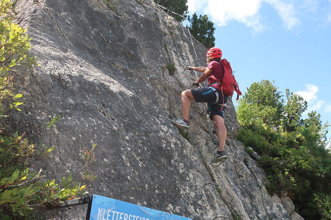 Knorren-Nadel-Klettersteig: Vom Einstieg rechts des Steinbock-Klettersteiges einfach (B) hoch zu einer Leiter. Den Steinbock-Klettersteig kreuzen