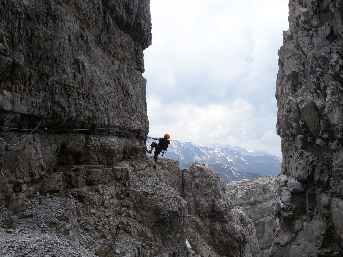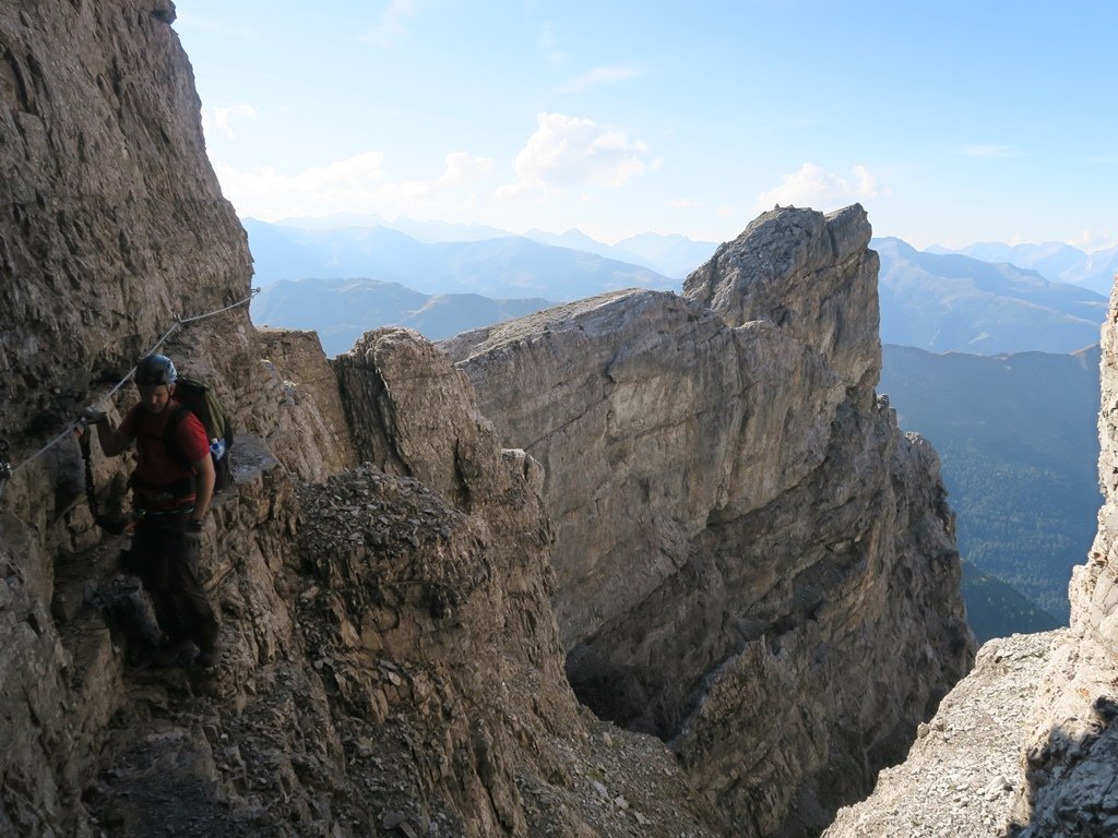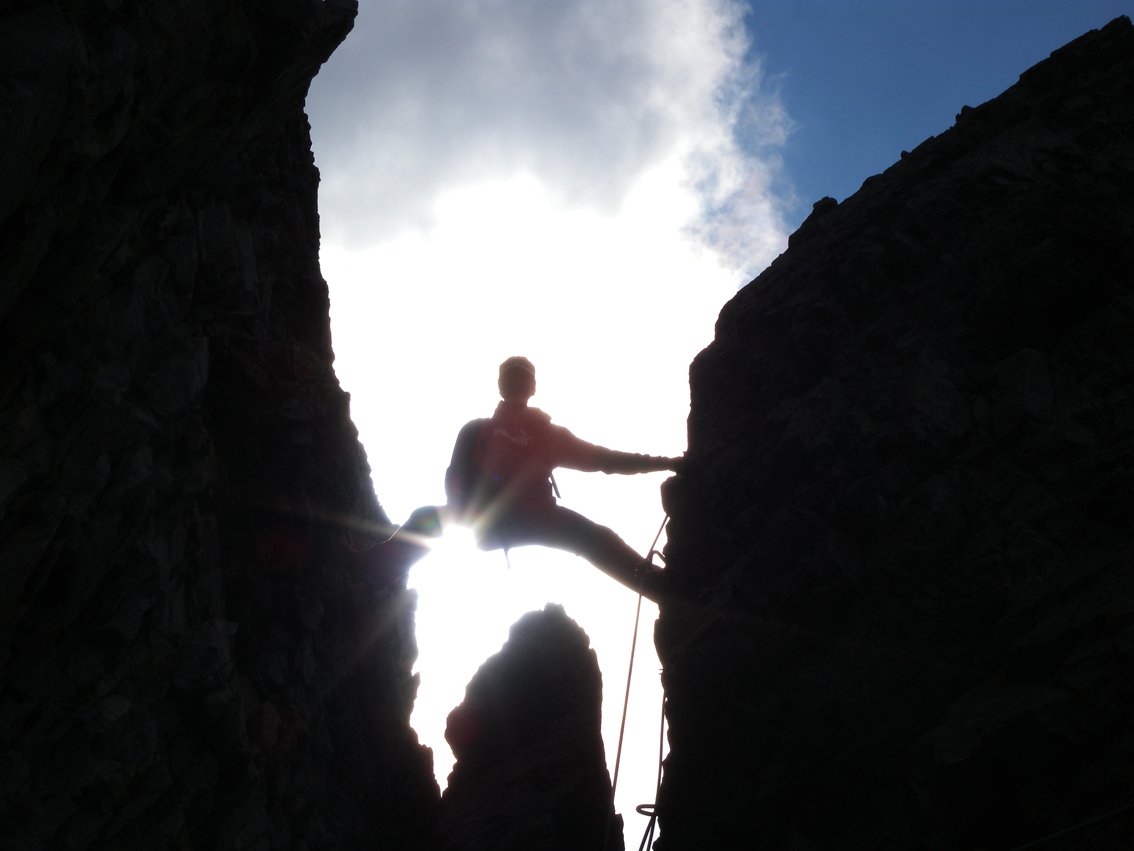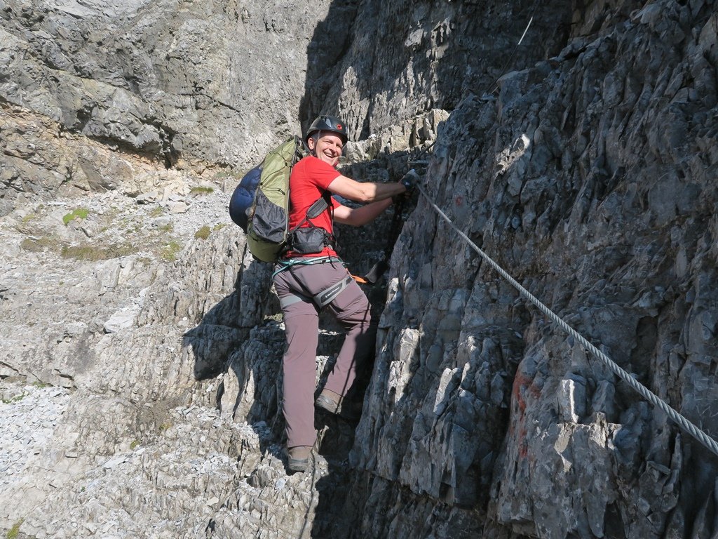 Man muss auf dem Klettersteig wieder abklettern. Von der Alpenklubscharte steigt man auf dem jeweiligen Zustiegsweg zurück zum Ausgangspunkt.