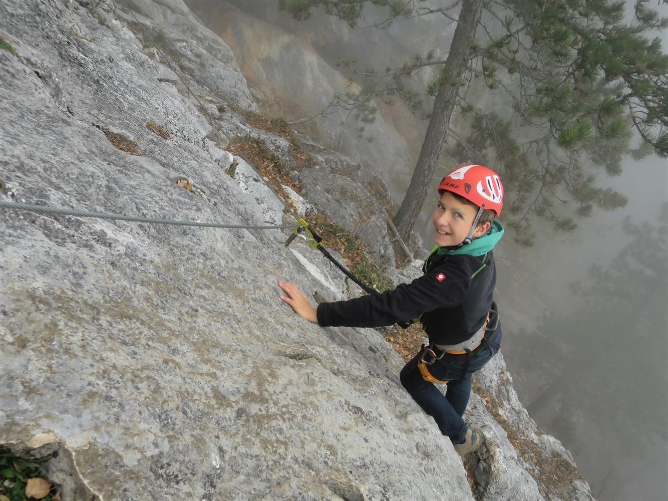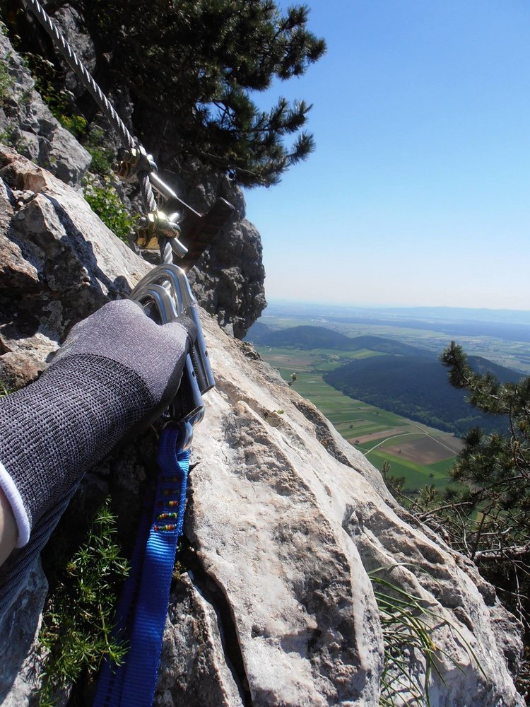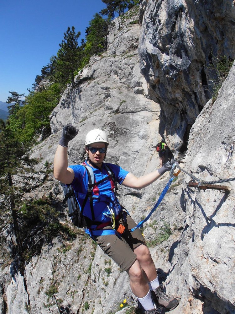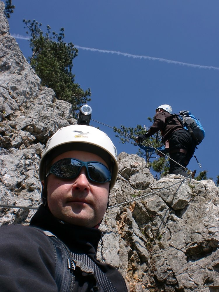 Rund 15 Jahe später hat die Steirerspur einen neuen Einstieg bekommen. Er zweigt bereits vor dem Hochplateau vom Springlessteig ab und trifft in genau in der Mitte des alten Steiges auf den Klettersteig. Rechts oder links? Wir empfehlen zuerst rechts und dann wieder zurück und links über den schwereren Teil hinauf zum Hubertushaus.