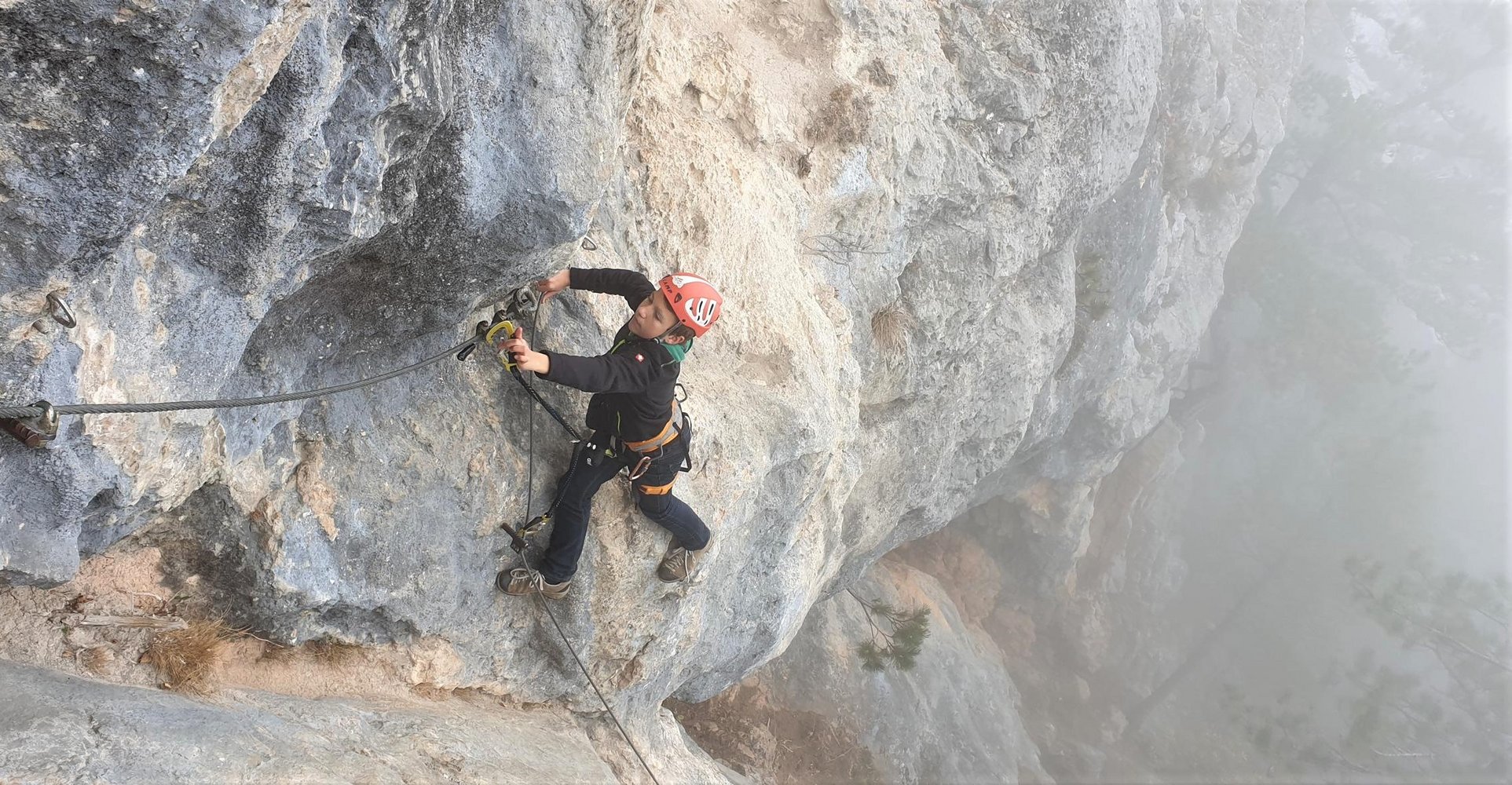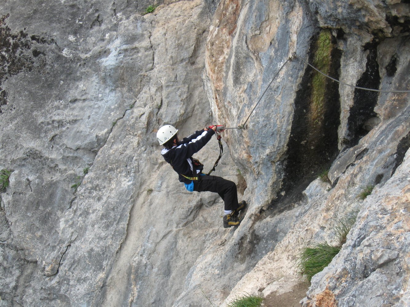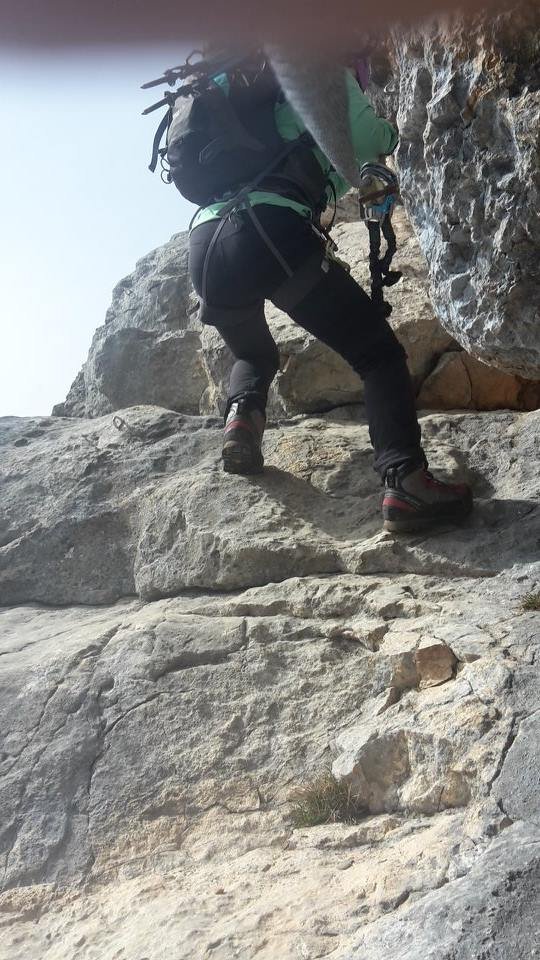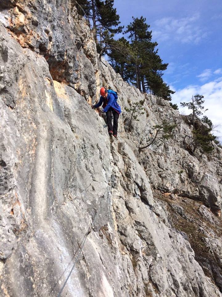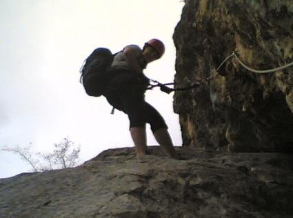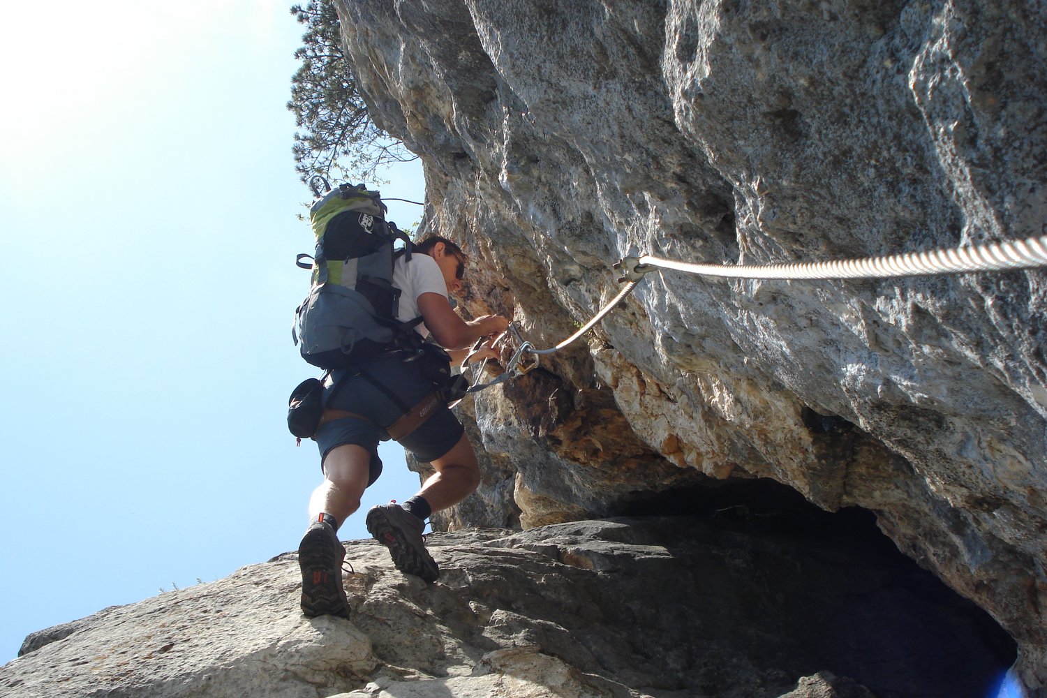 Vom Einstieg ca.. 100 Meter waagrecht und auch kurz leicht absteigend nach links (A, A/B und eine kurze Plattenstelle im Abstieg B) unter eine überhängende Wand bei der sich der Klettersteig nach rechts und links gabelt.